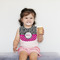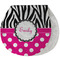 A white scalloped circle label edged in black highlights the personalization of your choice. A wide hot pink band trimmed in white completes the design.