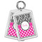 A white scalloped circle label edged in black highlights the personalization of your choice. A wide hot pink band trimmed in white completes the design.