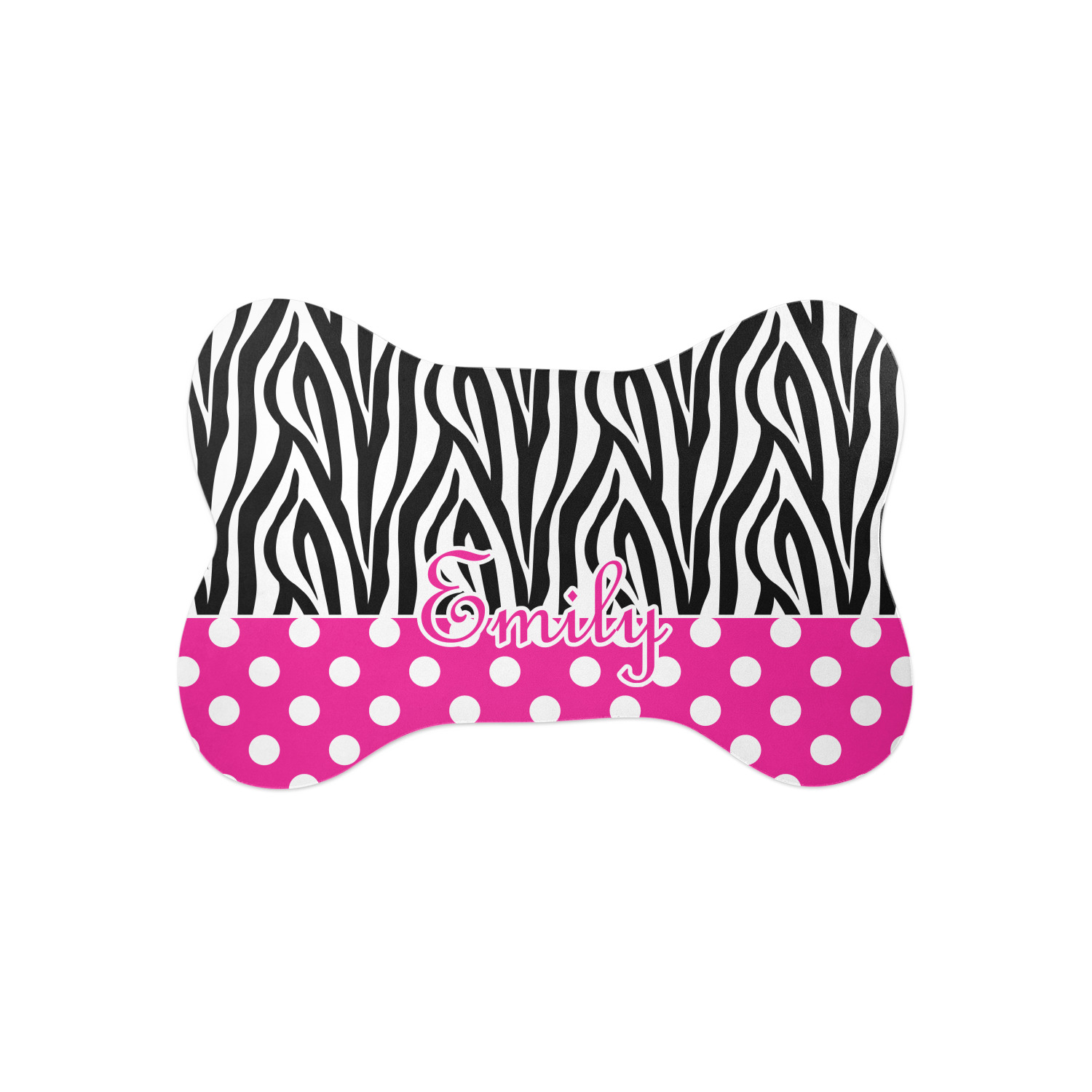 A white scalloped circle label edged in black highlights the personalization of your choice. A wide hot pink band trimmed in white completes the design.