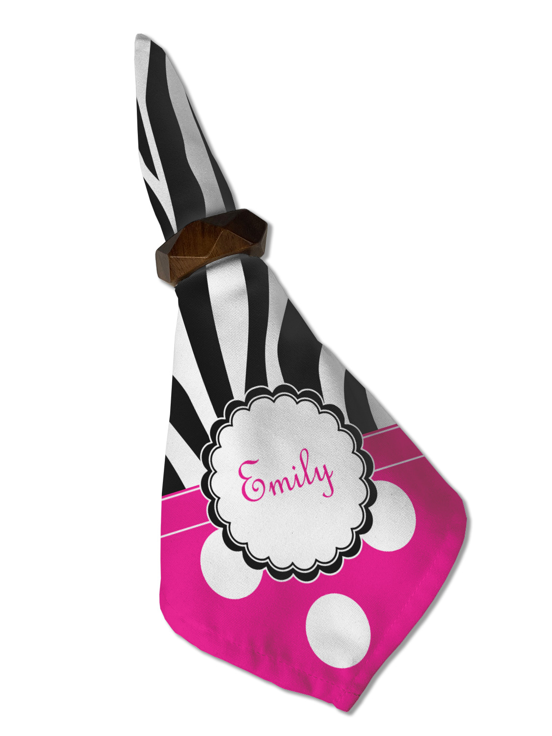 A white scalloped circle label edged in black highlights the personalization of your choice. A wide hot pink band trimmed in white completes the design.