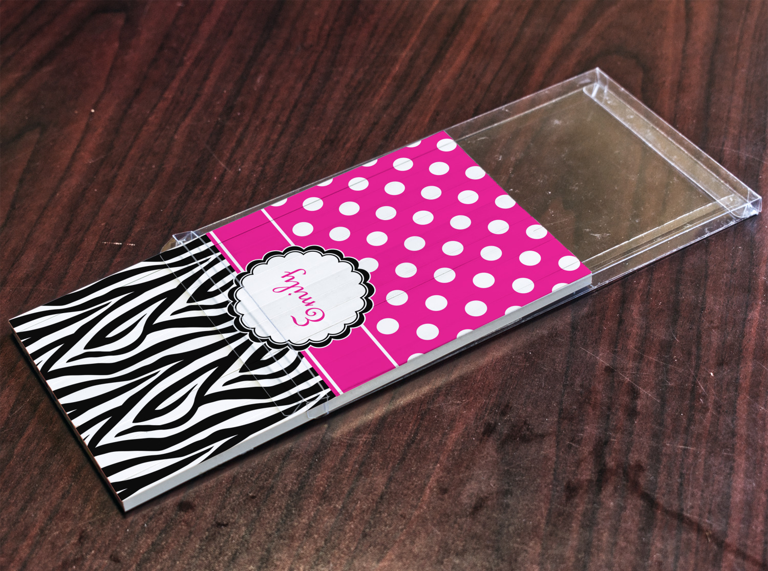 A white scalloped circle label edged in black highlights the personalization of your choice. A wide hot pink band trimmed in white completes the design.