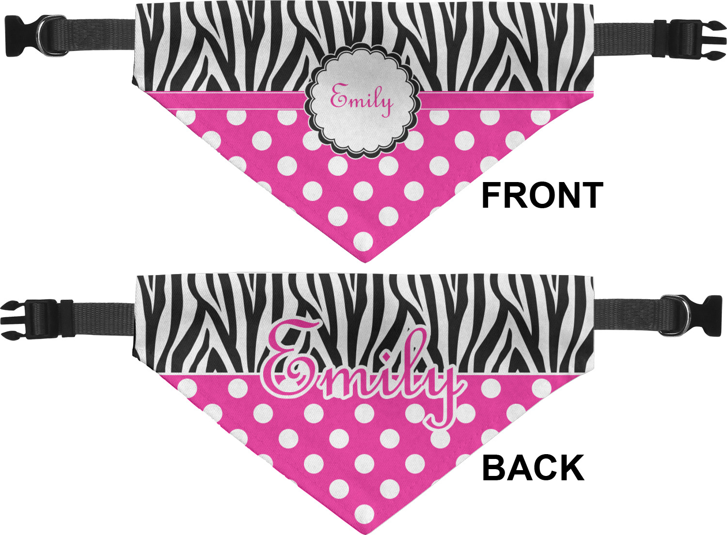 We print the front and back of these dog bandanas with your customized design. The bandana itself is made from a durable polyester, sewn together with a gap large enough to accommodate any collar. Regardless, the bandana includes a plain black, canvas collar with plastic snaps, that can easily be removed if desired. These dog bandana collars are available in four sizes: small, medium, large, and extra large. Please see our sizing chart for more information regarding the dimensions of each size.