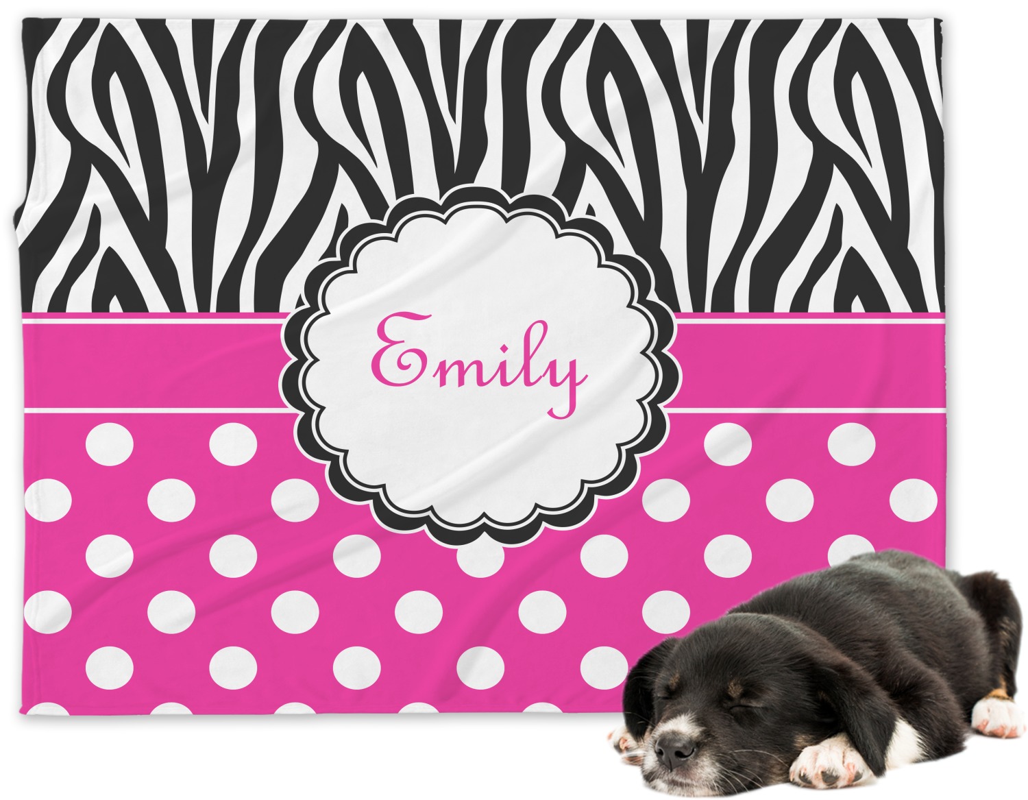 Here is a wonderful zebra print with a fun, modern twist. The top of this design features a black and white traditional zebra print. To add color and flair we have paired the zebra pattern with a fun hot pink and white polka dot pattern on bottom.