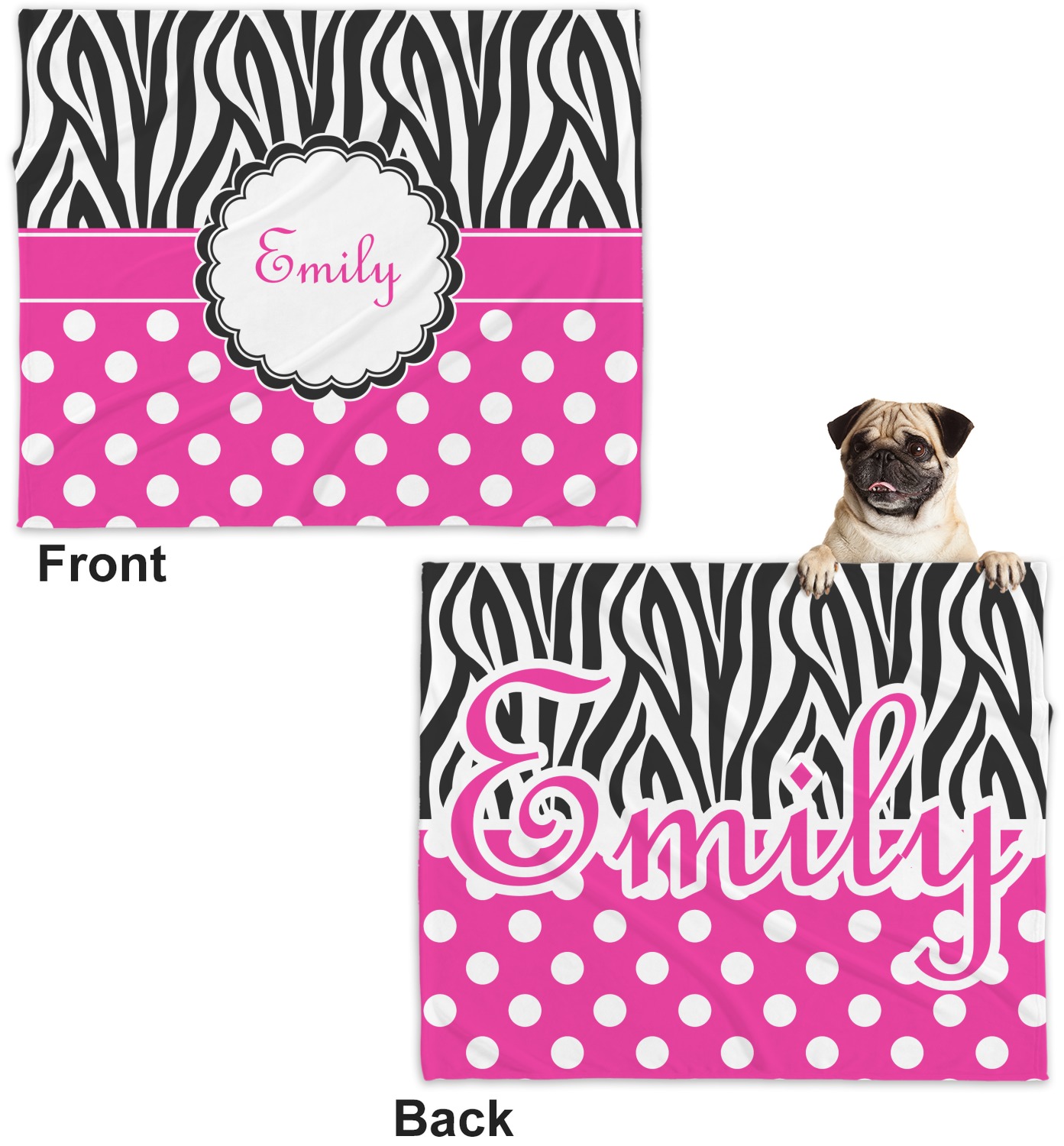 These dog blankets are crafted from a gentle, soft-to-the-touch, minky material. We print your customizations, either matching or differing, on both the top and underside of the blanket. These personalized dog blankets are available in two sizes: regular and large. Our regular size, at 40" x 30", accommodates small and some medium size dogs. At 60" x 50", our large dog blanket is a better fit for bigger breeds. Though specialized for dogs, these blankets still make a thoughtful gift for your favorite feline, or any other pet in mind!