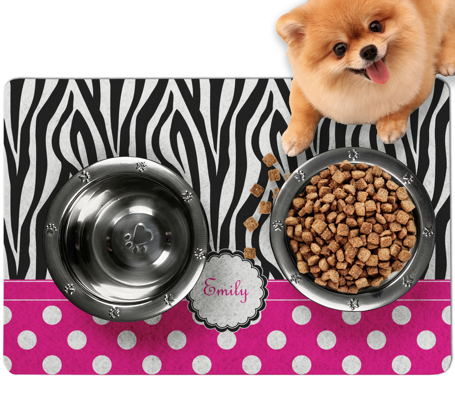 This dog bowl mat, fabricated from polyester, proudly displays your customized design on its top, while its bottom includes a non-slip rubber. This feature allows it to remain firmly in place, even when your dog spills his/her water. With 3 sizes available (18" x 12", 24" x 18", 30" x 24"), the pet food mat has ample space for both a food and water bowl for any sized dogs. Though specified for dogs' use, these mats are also a splendid option for cats.