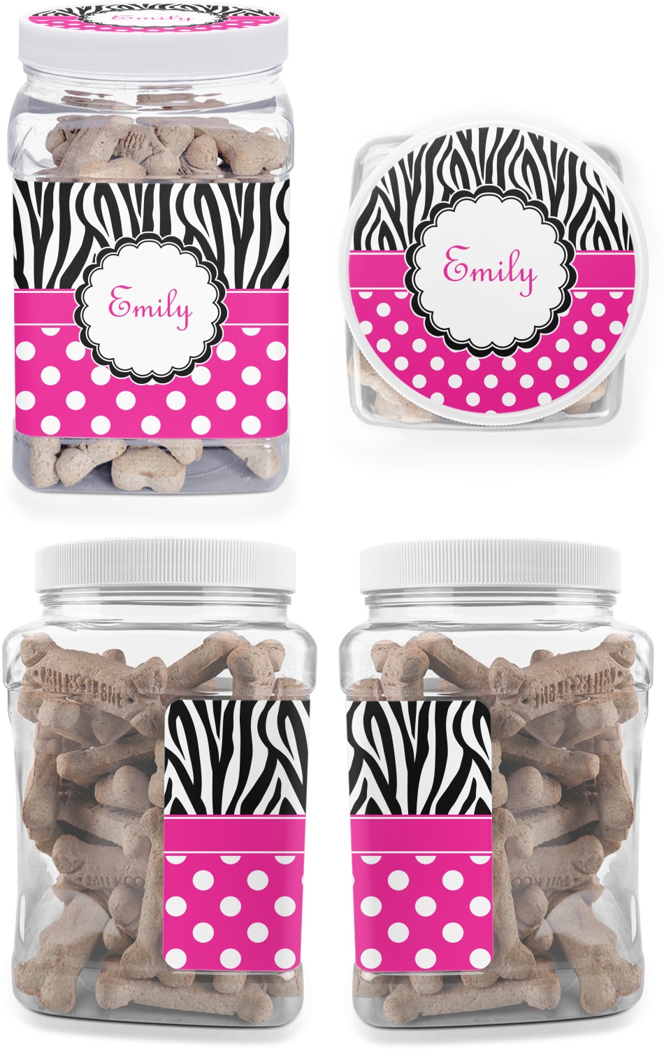 This half gallon jar, made from a sturdy plastic, is the perfect way to keep treats from any naughty pet paws, while still keeping them ready on hand for when your pup performs an impressive trick. This dog cookie jar features a screw-on, white lid that displays your personalized design on a vinyl sticker. We apply another customized sticker that wraps around the front and sides of the jar. Our dog treat jar also has indentations on the rear ends of the sides, which allows for convenient handling, and its square frame allows for easy storage.