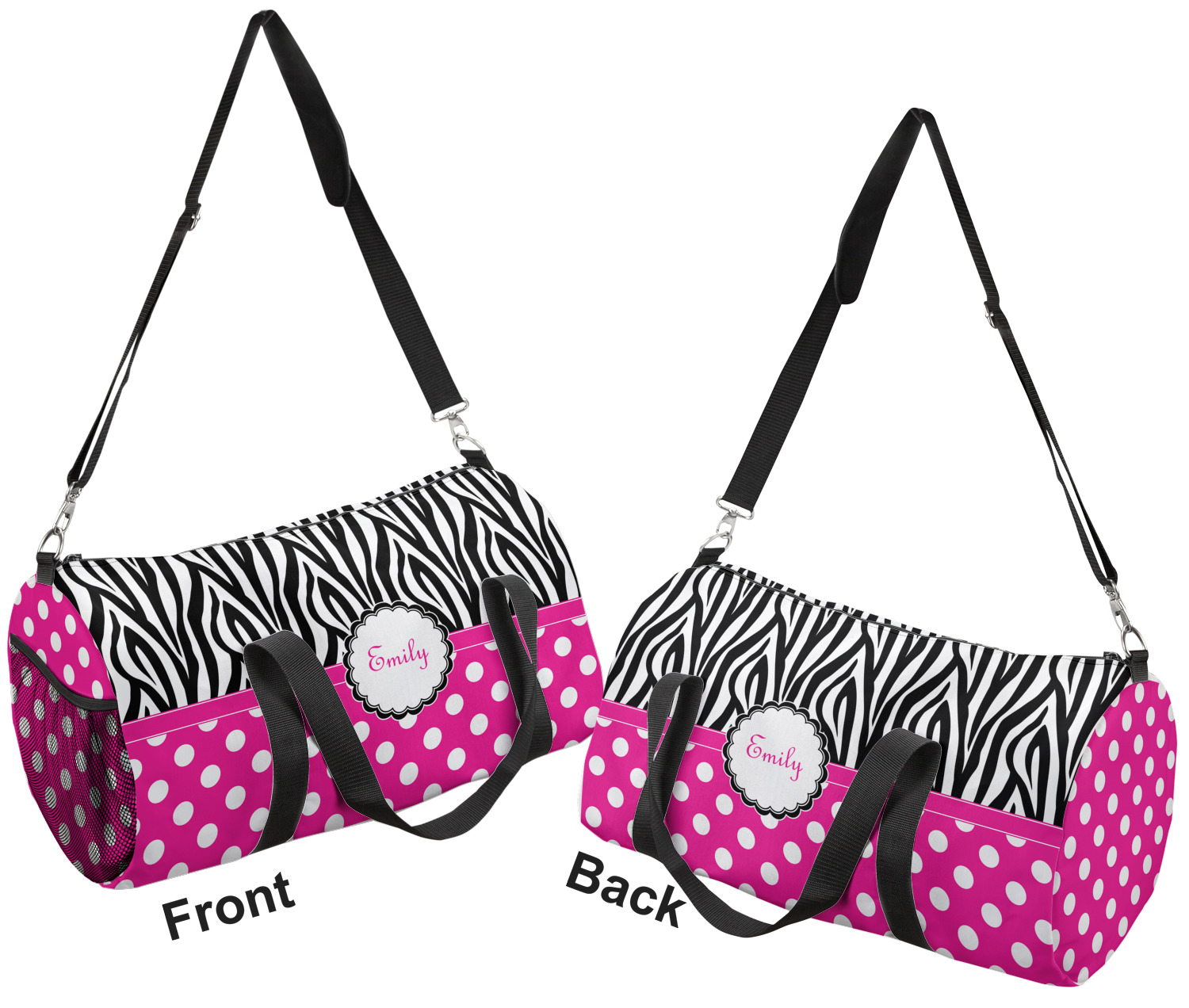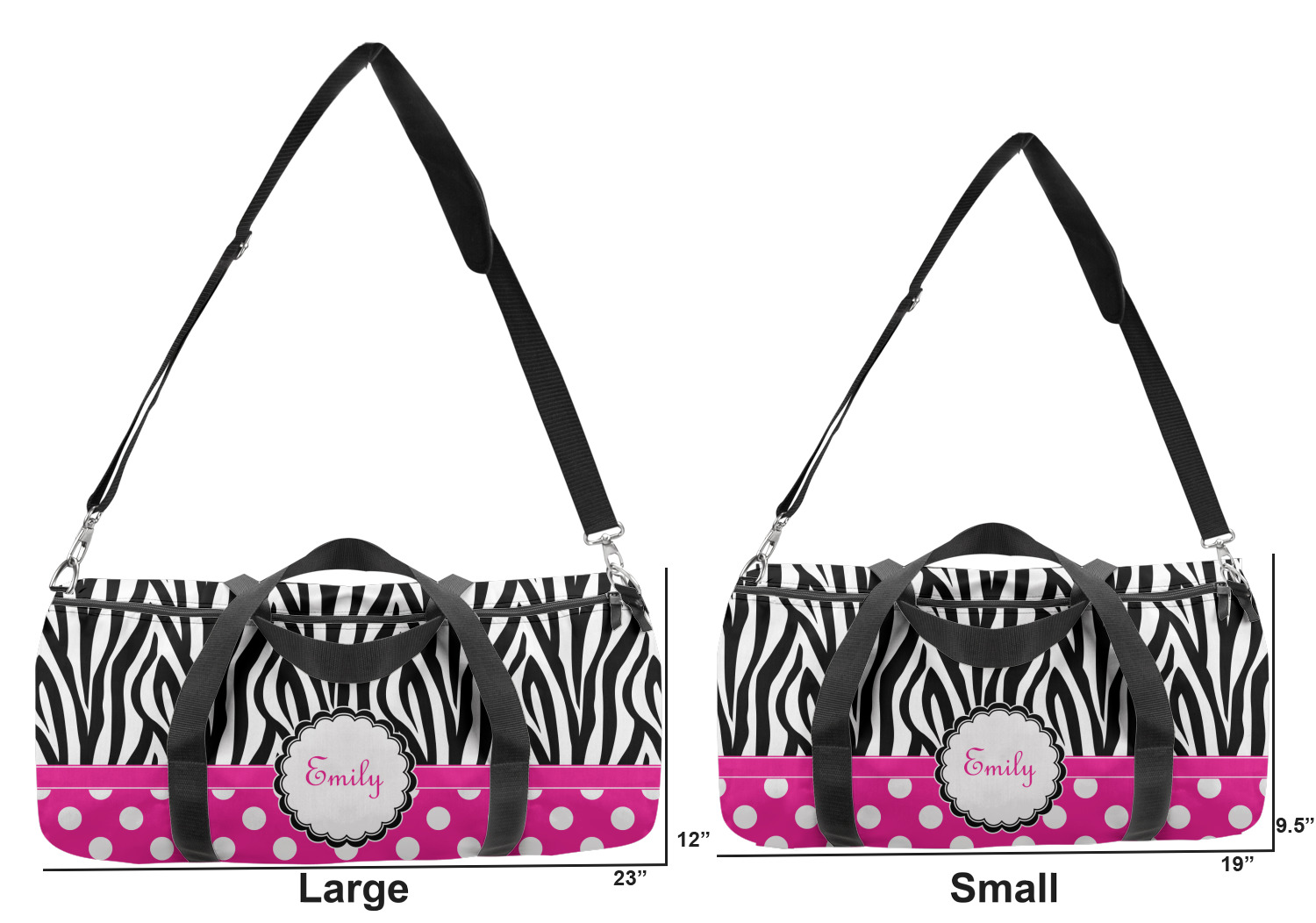 This duffle is a sturdy bag made of a canvas material. It comes in two sizes: Small (19"W x 9.5"H x 9.5"D) and Large (23"W x 12"H x 12"D). The bag is a cylindrical shape with a black adjustable strap and two handles. On one side is an elastic pouch to put a waterbottle or other small item. Your product will be sublimated with your design and is able to be designed on the front, back, and sides. Be sure to remember that the straps may cut into parts of your design if you upload your own artwork.