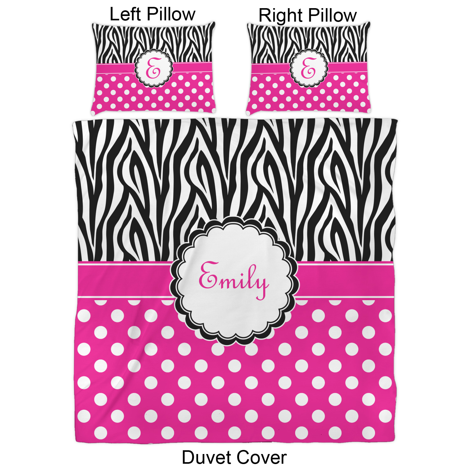 Here is a wonderful zebra print with a fun, modern twist. The top of this design features a black and white traditional zebra print. To add color and flair we have paired the zebra pattern with a fun hot pink and white polka dot pattern on bottom.