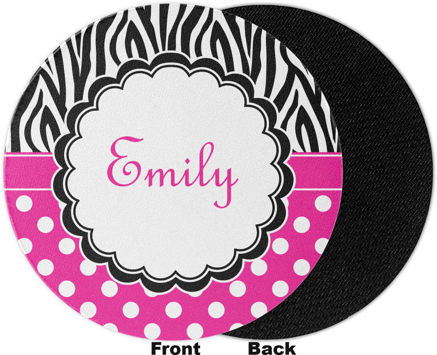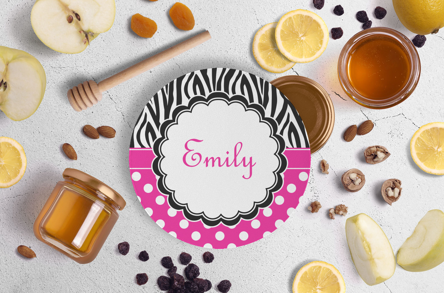 A white scalloped circle label edged in black highlights the personalization of your choice. A wide hot pink band trimmed in white completes the design.