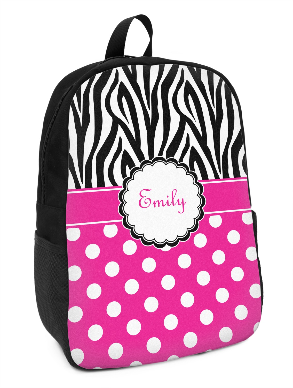Here is a wonderful zebra print with a fun, modern twist. The top of this design features a black and white traditional zebra print. To add color and flair we have paired the zebra pattern with a fun hot pink and white polka dot pattern on bottom.