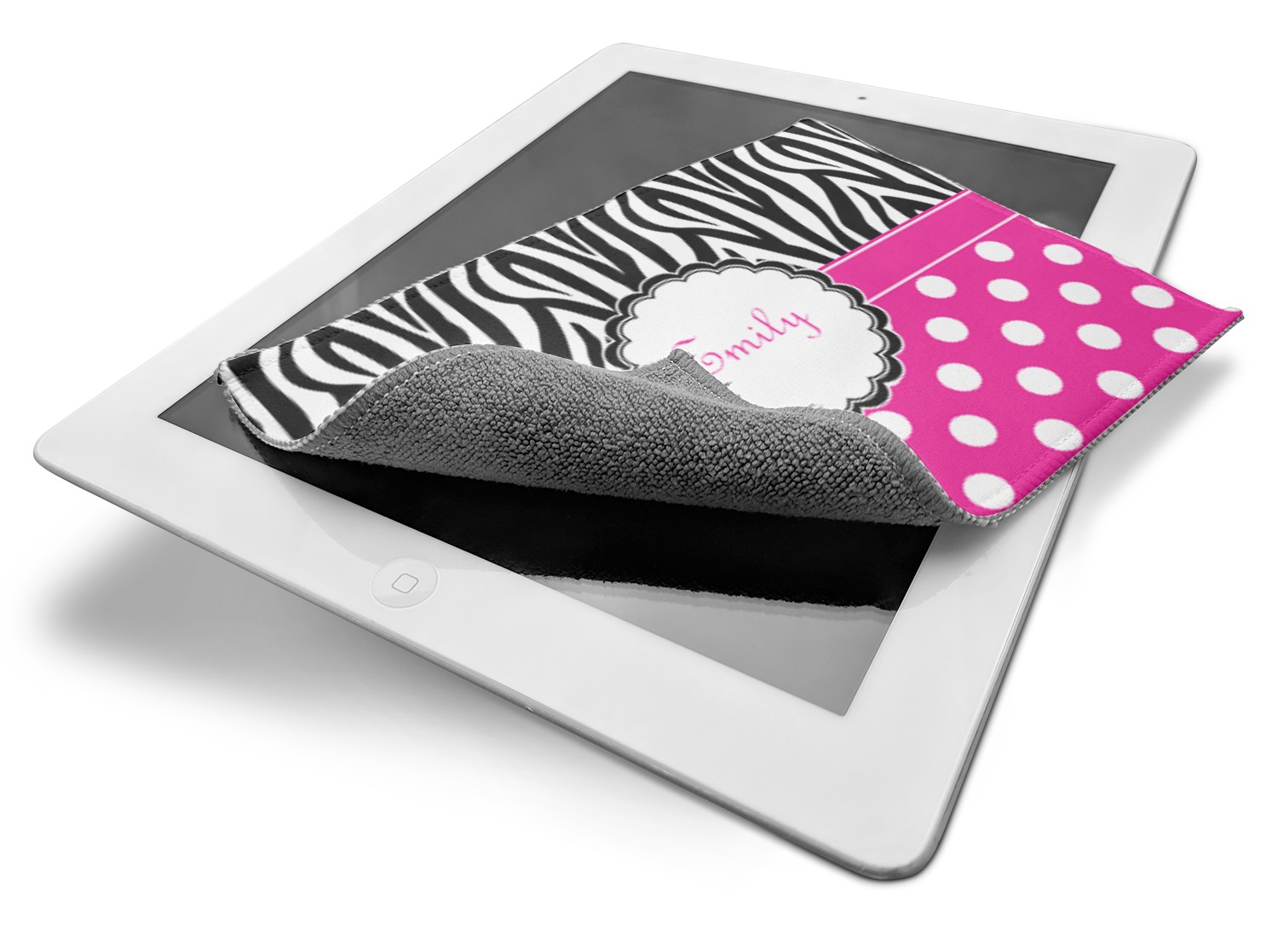 The back of this cleaning cloth is made from a gentle, grey microfiber material, that is masterful at removing smudges, grease, and fingerprints from lenses or electronic screens. The front side of the screen cleaner displays your personalized design in vibrant color. A beautiful stitch lines the edges and secures the microfiber to the polyester top. We provide you with the option of customizing this screen horizontally or vertically, depending on your preferences.