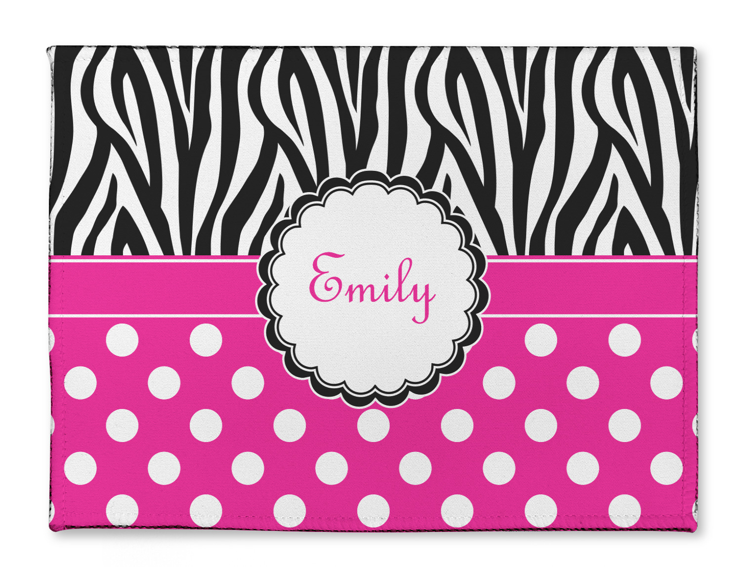 Here is a wonderful zebra print with a fun, modern twist. The top of this design features a black and white traditional zebra print. To add color and flair we have paired the zebra pattern with a fun hot pink and white polka dot pattern on bottom.