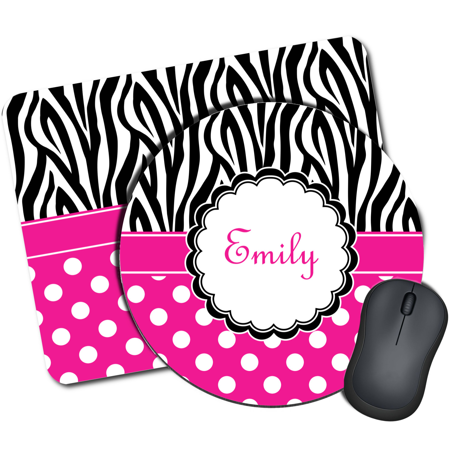 A white scalloped circle label edged in black highlights the personalization of your choice. A wide hot pink band trimmed in white completes the design.