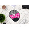 A white scalloped circle label edged in black highlights the personalization of your choice. A wide hot pink band trimmed in white completes the design.