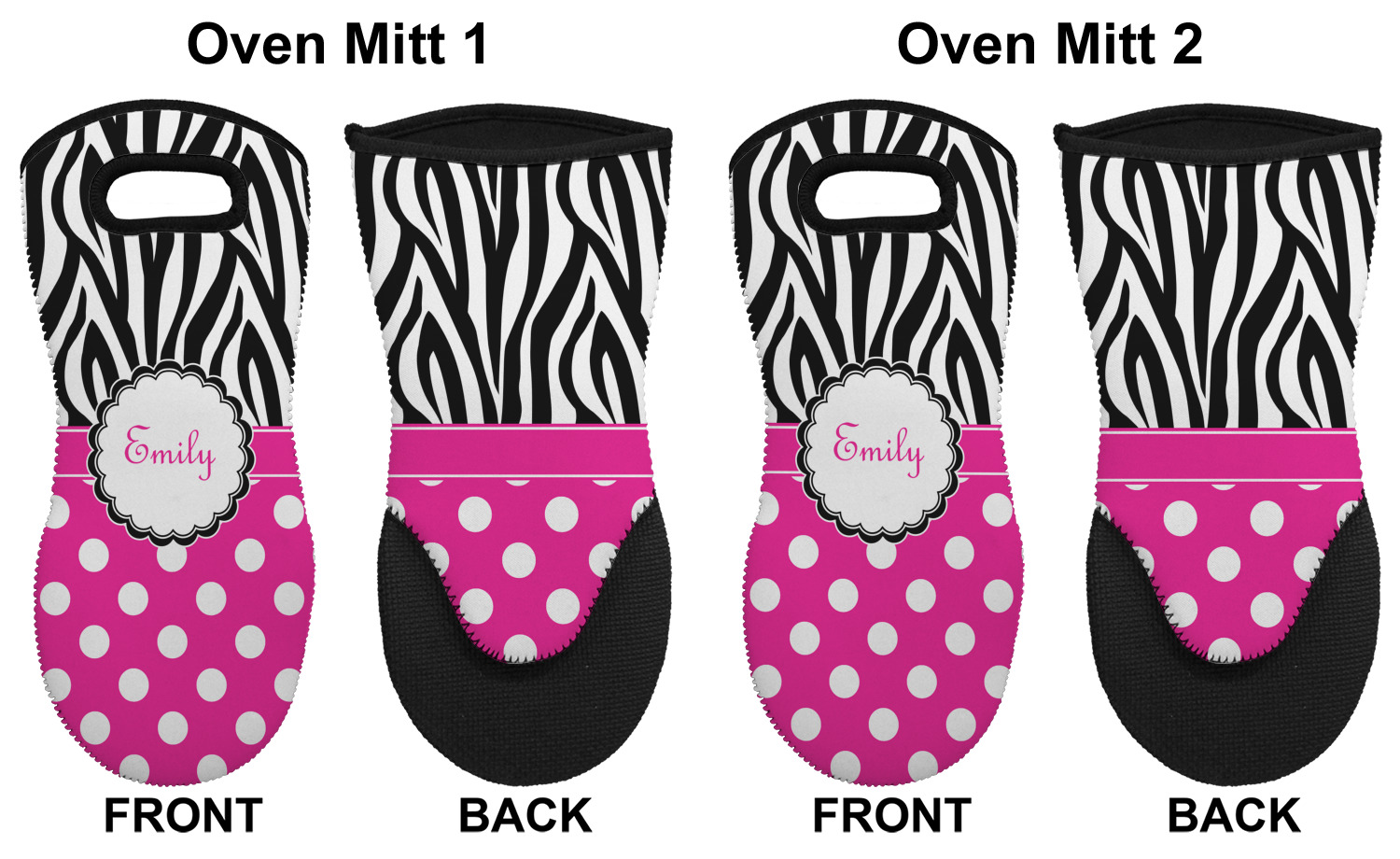 These heat resistant gloves are made entirely of a durable neoprene; the front features a softer texture, while the palm's side has a textured surface, meant to handle heat up to 500 degrees Fahrenheit. Thick, heavy duty stitching connects the two sides. A small, oval cutout appears on the front, and can be used to hang and store the mitt. Your personalization appears on the front, and the upper part of the back of the mitt. The style of these oven mitts are suitable for both the right and left hand, depending on your needs. If you need one for each hand, be sure to order two!