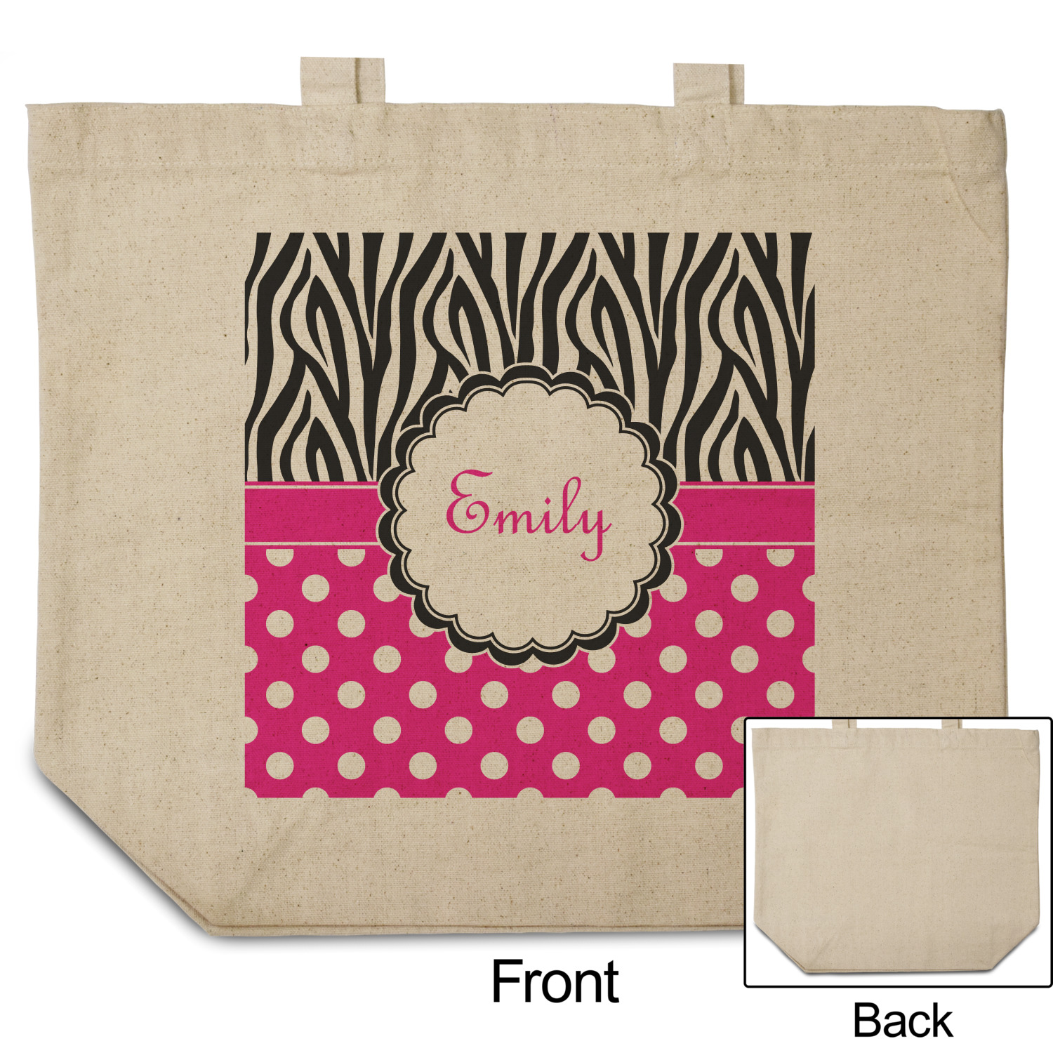 A white scalloped circle label edged in black highlights the personalization of your choice. A wide hot pink band trimmed in white completes the design.