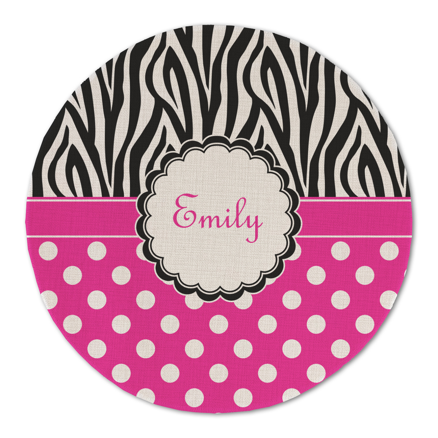 A white scalloped circle label edged in black highlights the personalization of your choice. A wide hot pink band trimmed in white completes the design.