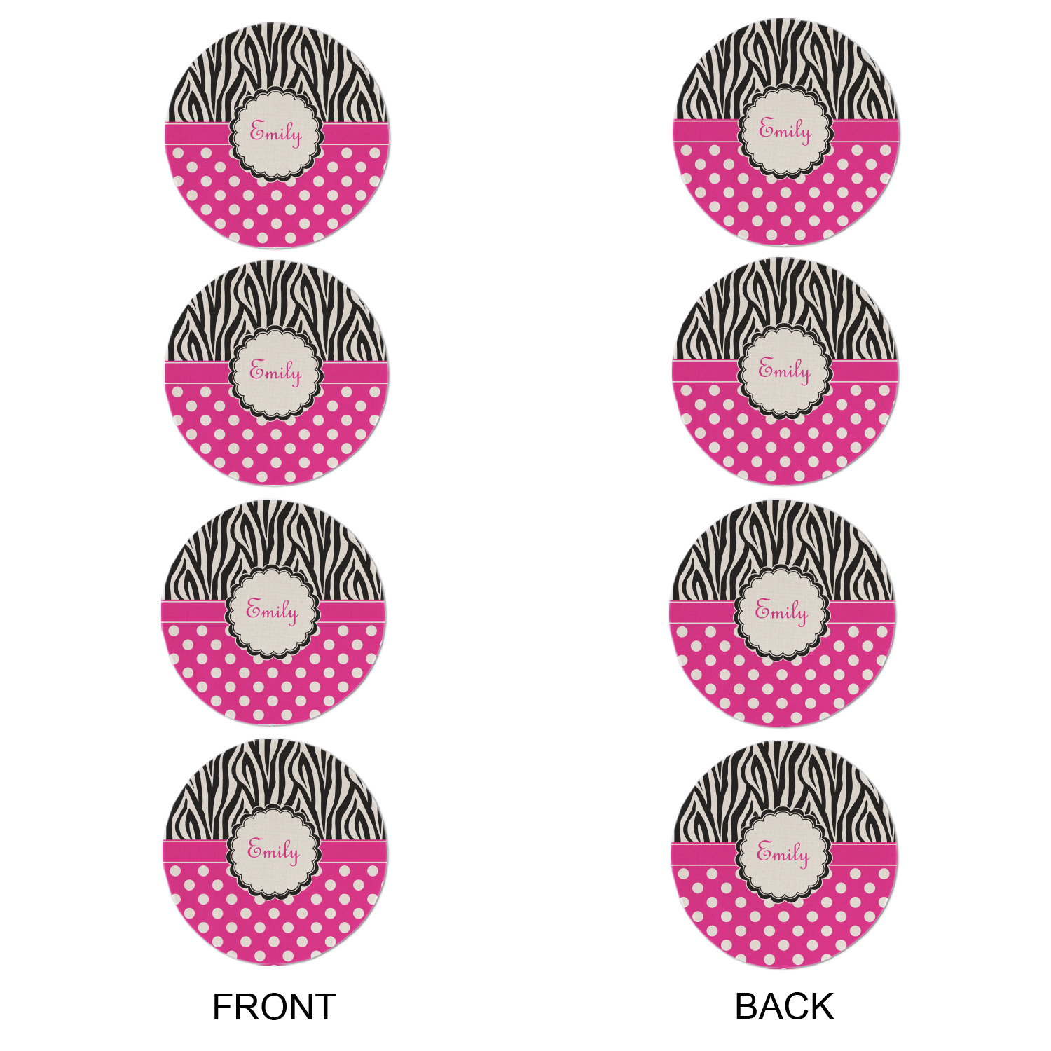 A white scalloped circle label edged in black highlights the personalization of your choice. A wide hot pink band trimmed in white completes the design.