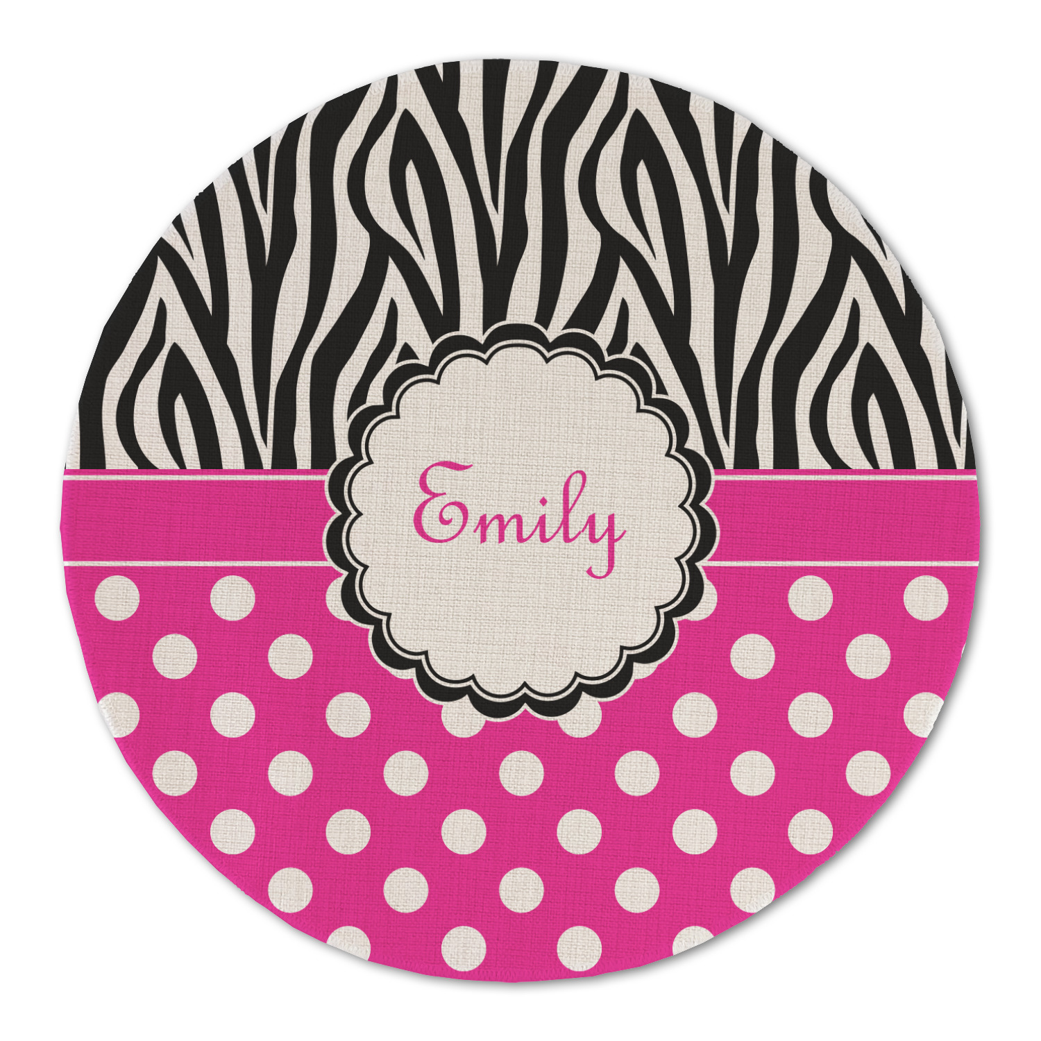 A white scalloped circle label edged in black highlights the personalization of your choice. A wide hot pink band trimmed in white completes the design.
