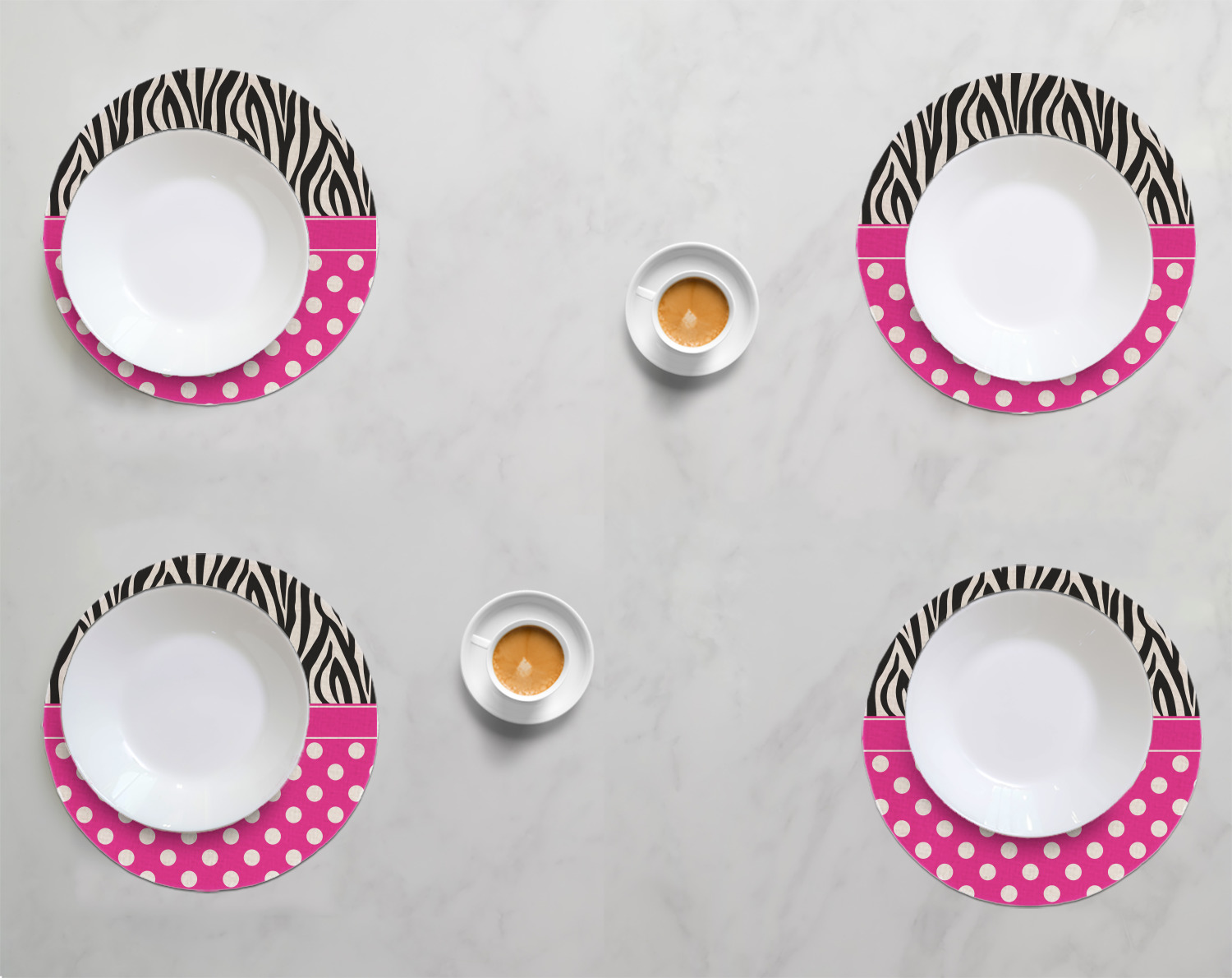 Here is a wonderful zebra print with a fun, modern twist. The top of this design features a black and white traditional zebra print. To add color and flair we have paired the zebra pattern with a fun hot pink and white polka dot pattern on bottom.