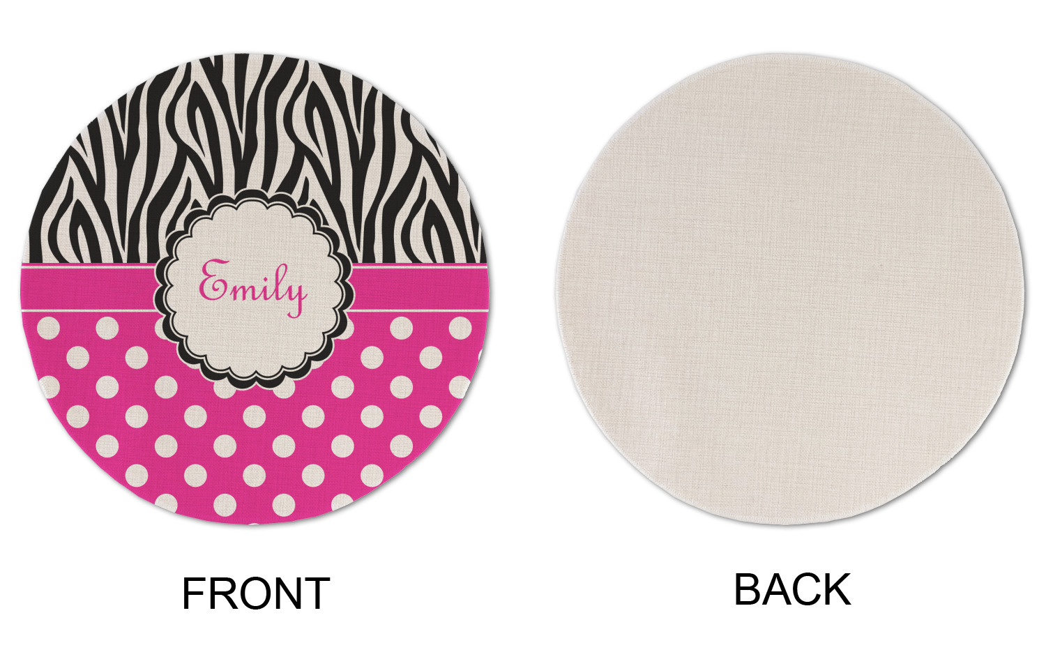 A white scalloped circle label edged in black highlights the personalization of your choice. A wide hot pink band trimmed in white completes the design.