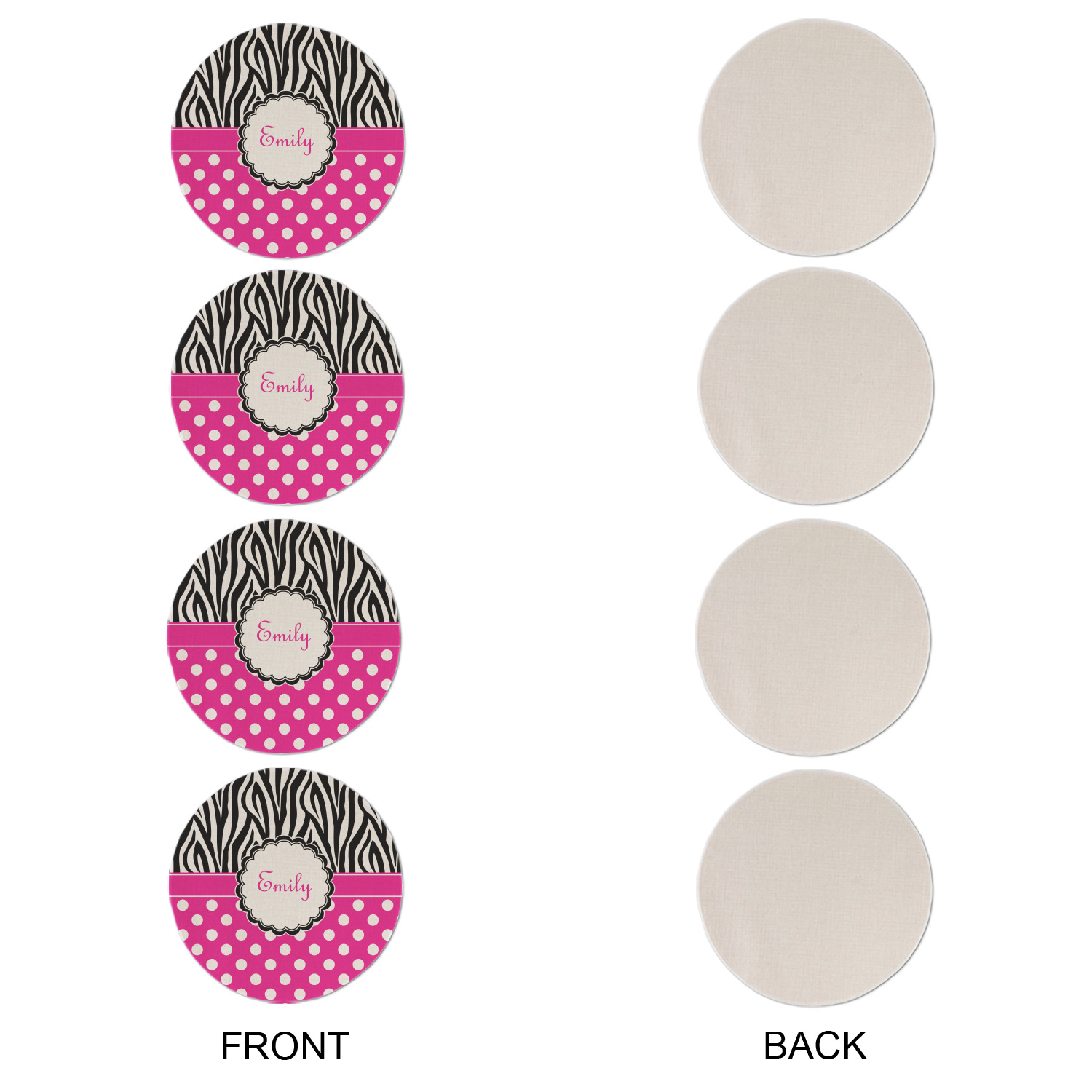 A white scalloped circle label edged in black highlights the personalization of your choice. A wide hot pink band trimmed in white completes the design.