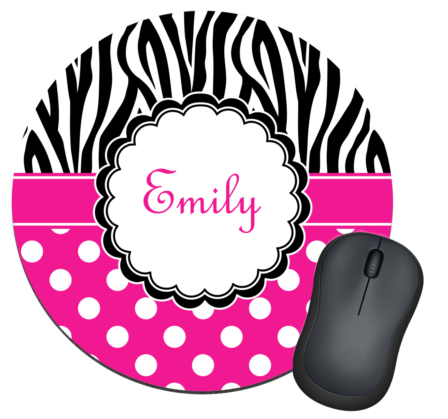 A white scalloped circle label edged in black highlights the personalization of your choice. A wide hot pink band trimmed in white completes the design.