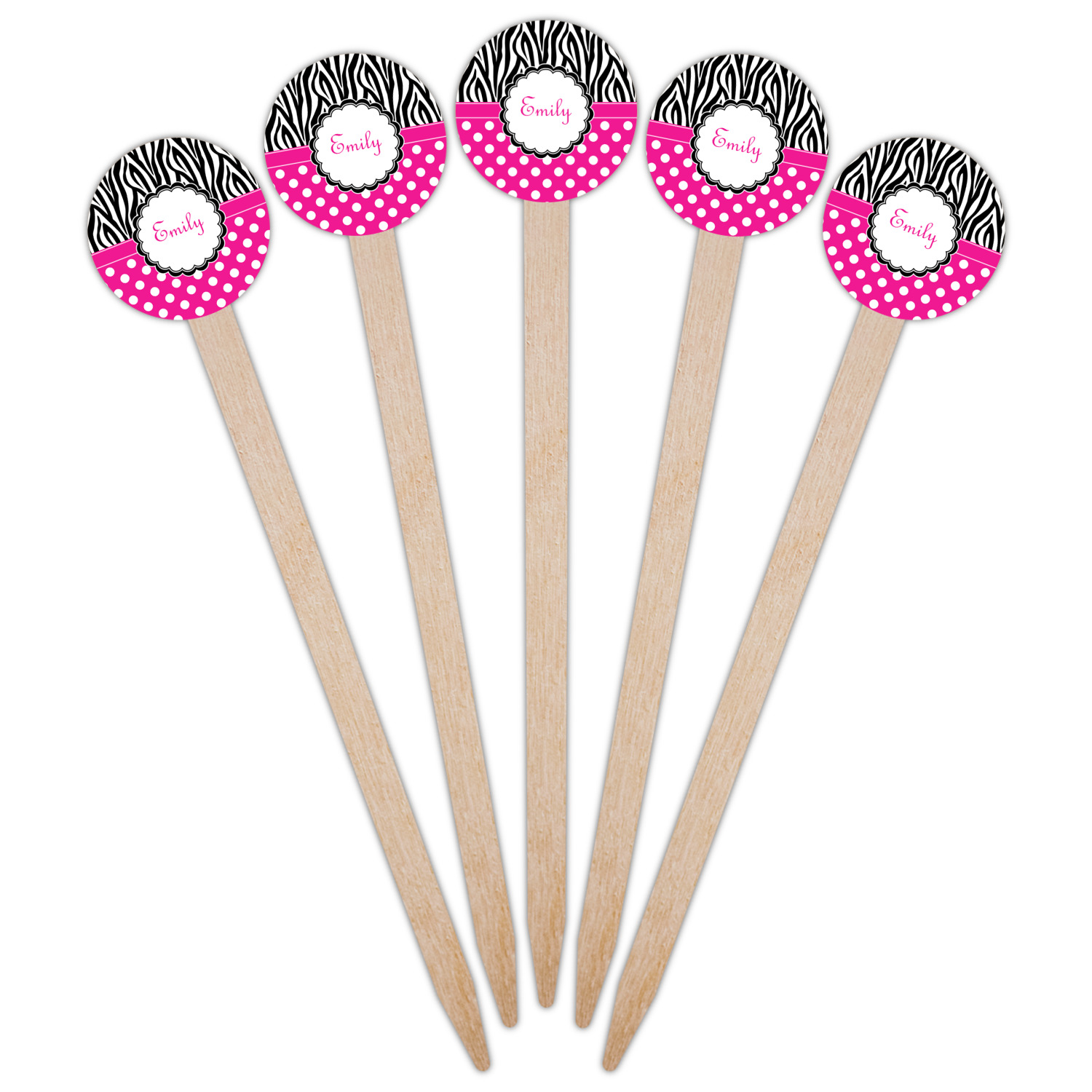 A white scalloped circle label edged in black highlights the personalization of your choice. A wide hot pink band trimmed in white completes the design.