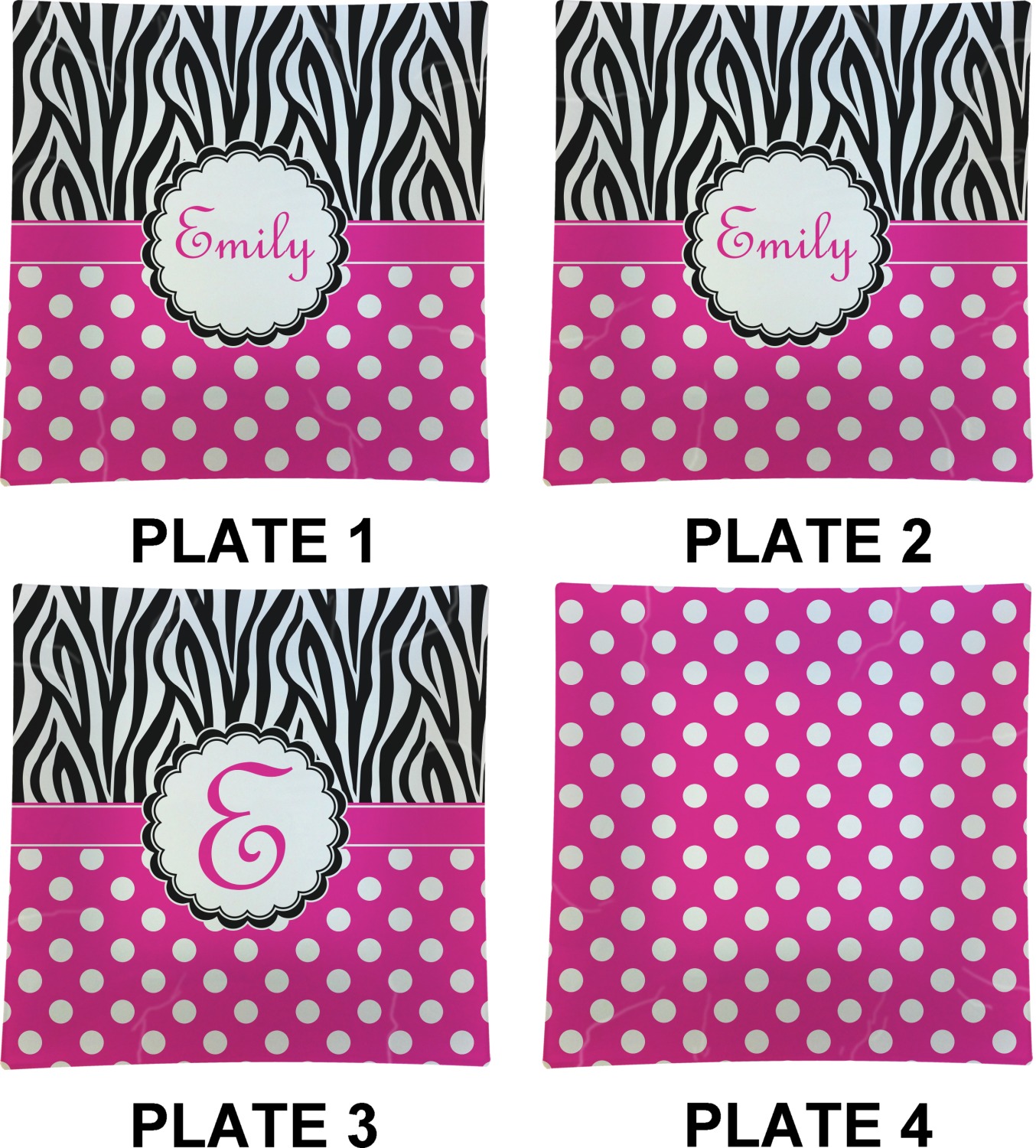 A white scalloped circle label edged in black highlights the personalization of your choice. A wide hot pink band trimmed in white completes the design.