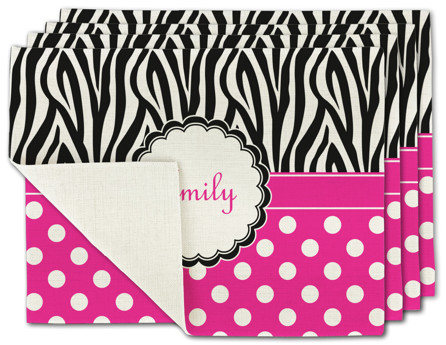 Here is a wonderful zebra print with a fun, modern twist. The top of this design features a black and white traditional zebra print. To add color and flair we have paired the zebra pattern with a fun hot pink and white polka dot pattern on bottom.