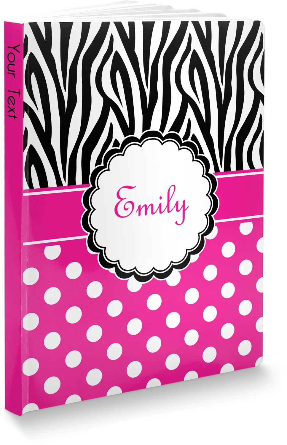 A white scalloped circle label edged in black highlights the personalization of your choice. A wide hot pink band trimmed in white completes the design.