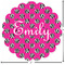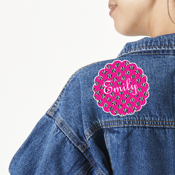 A white scalloped circle label edged in black highlights the personalization of your choice. A wide hot pink band trimmed in white completes the design.