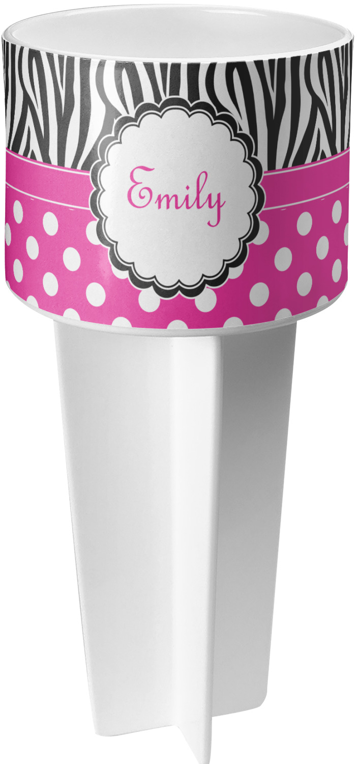 This cup holder has a large stake at its bottom that anchors it to the sand or ground below, while the cup holder rests above the stake. The entire drink holder is made of durable plastic and displays your customization around the cup holder portion. We sell these personalized beach spikers in two different colors: black and white.