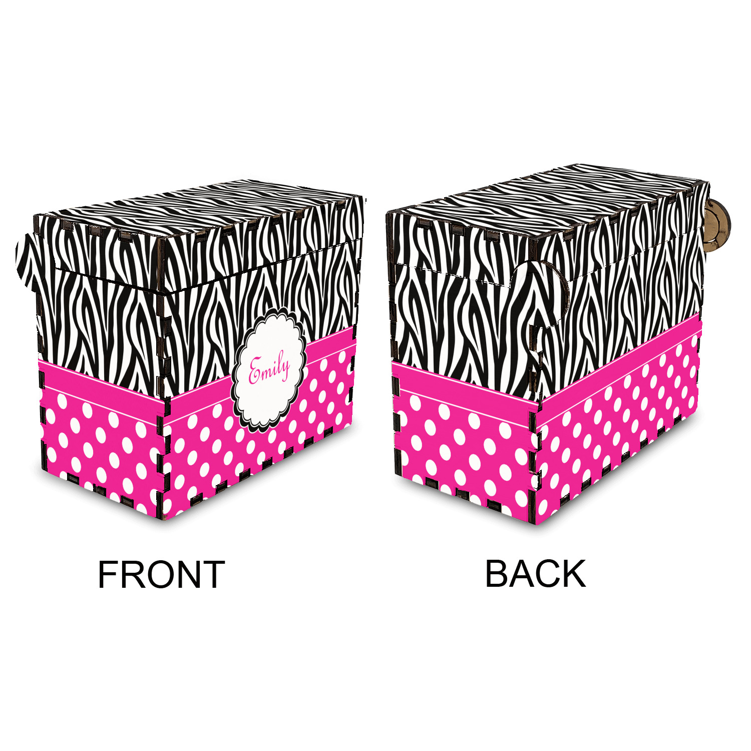 A white scalloped circle label edged in black highlights the personalization of your choice. A wide hot pink band trimmed in white completes the design.
