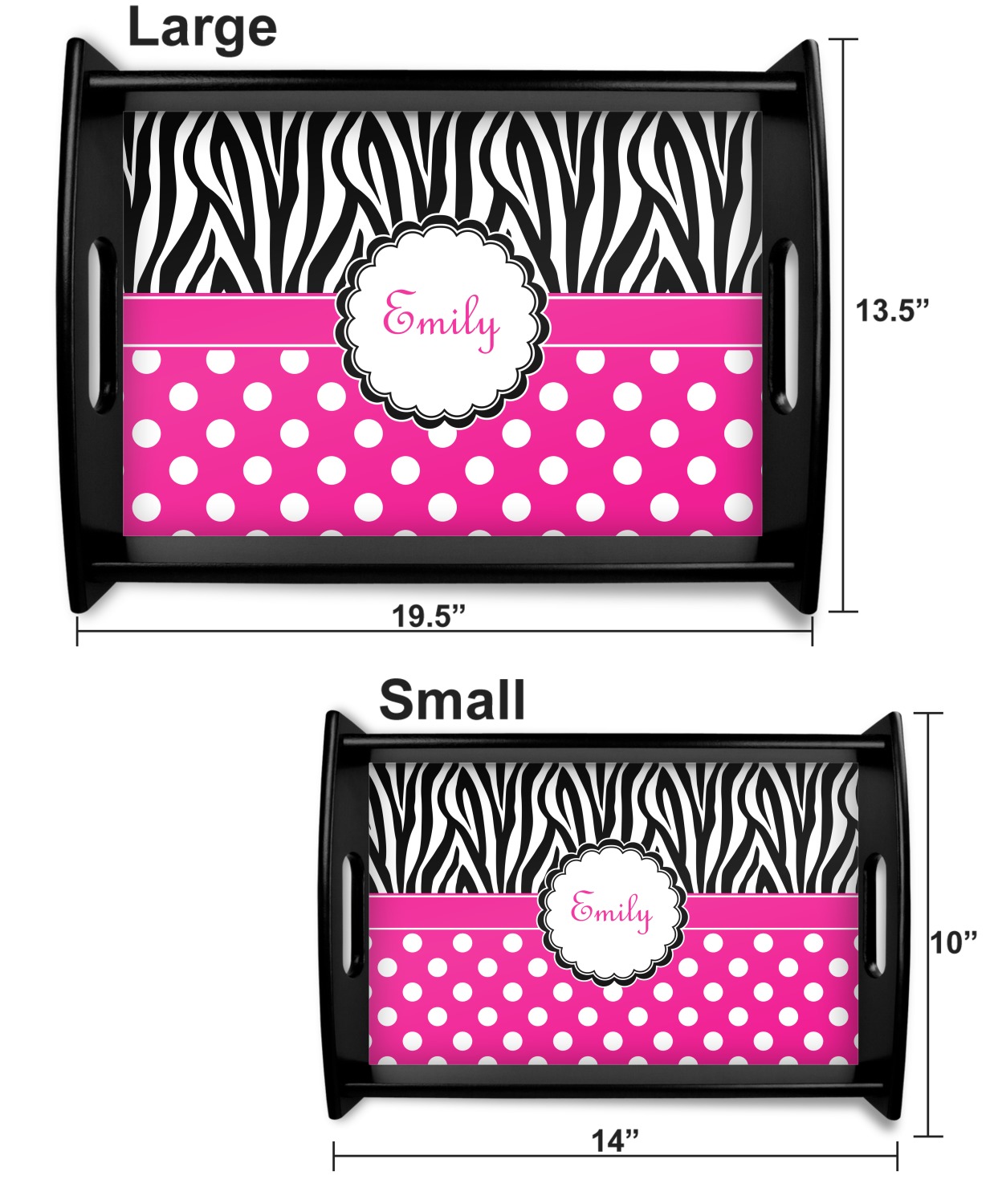 This serving tray with handles features square edges and two rounded sides, creating a very modern look. Each side is fabricated from a beautifully cut, natural wood. The bottom of the interior of the tray displays your customized design in bright, vibrant color. The tray is sold in both a black color and a natural wood look. Each variation of the wood serving tray has two sizes: Small, which is 14" x 10" x 2.25", and Large, which is 19.5" x 13.5" x 2.75".