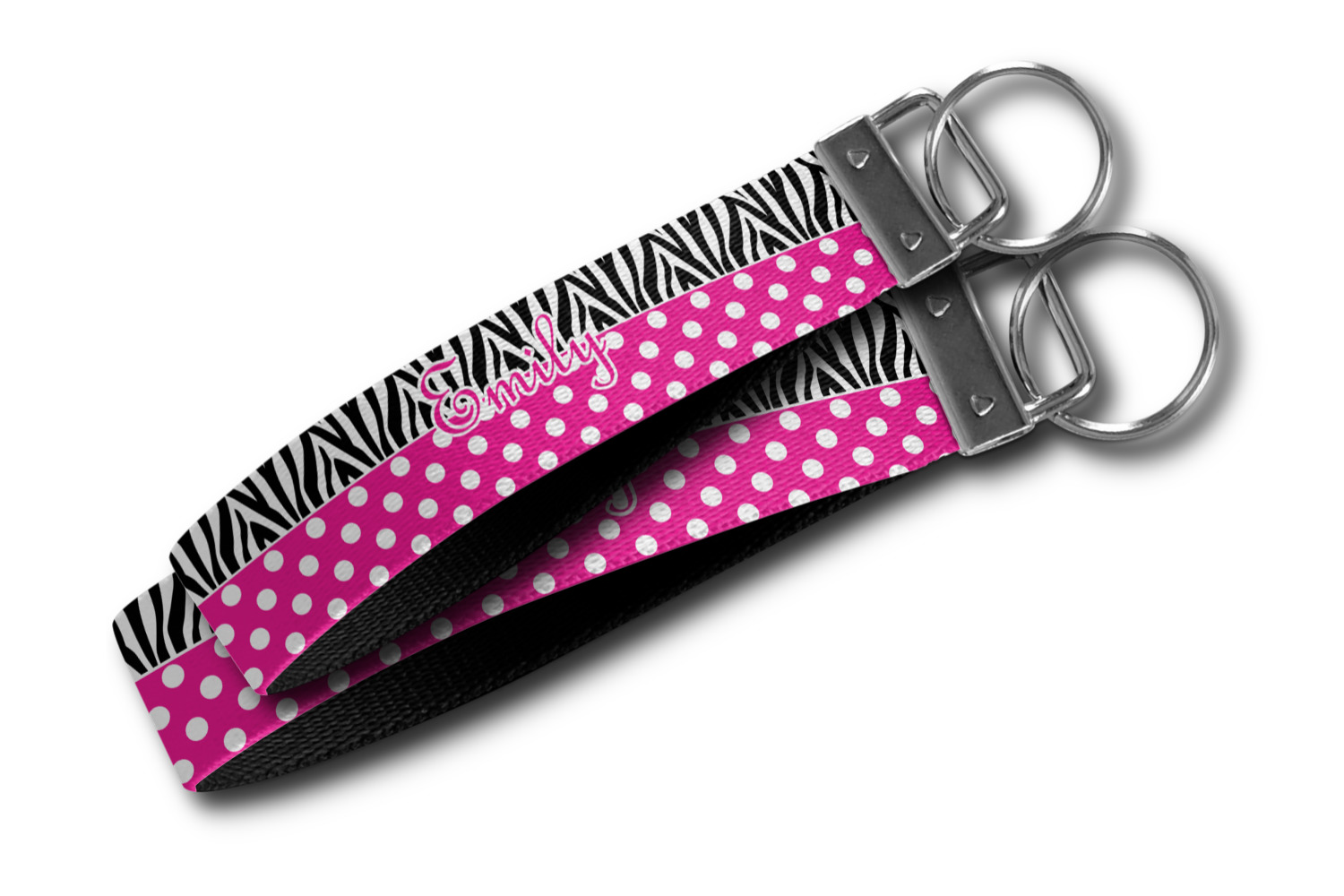 These key fob keychains are made from a polyester weave, right here in the USA. They feature a silver, metal clasp, attached to a round keyring. The piece gives the personalized wristlet a beautiful, finished look. Your customized design is printed on the outside of the keychain strap. We carry these wristlets in two sizes: small, which is 5 inches in width, and large, which is 5.5 inches in width.