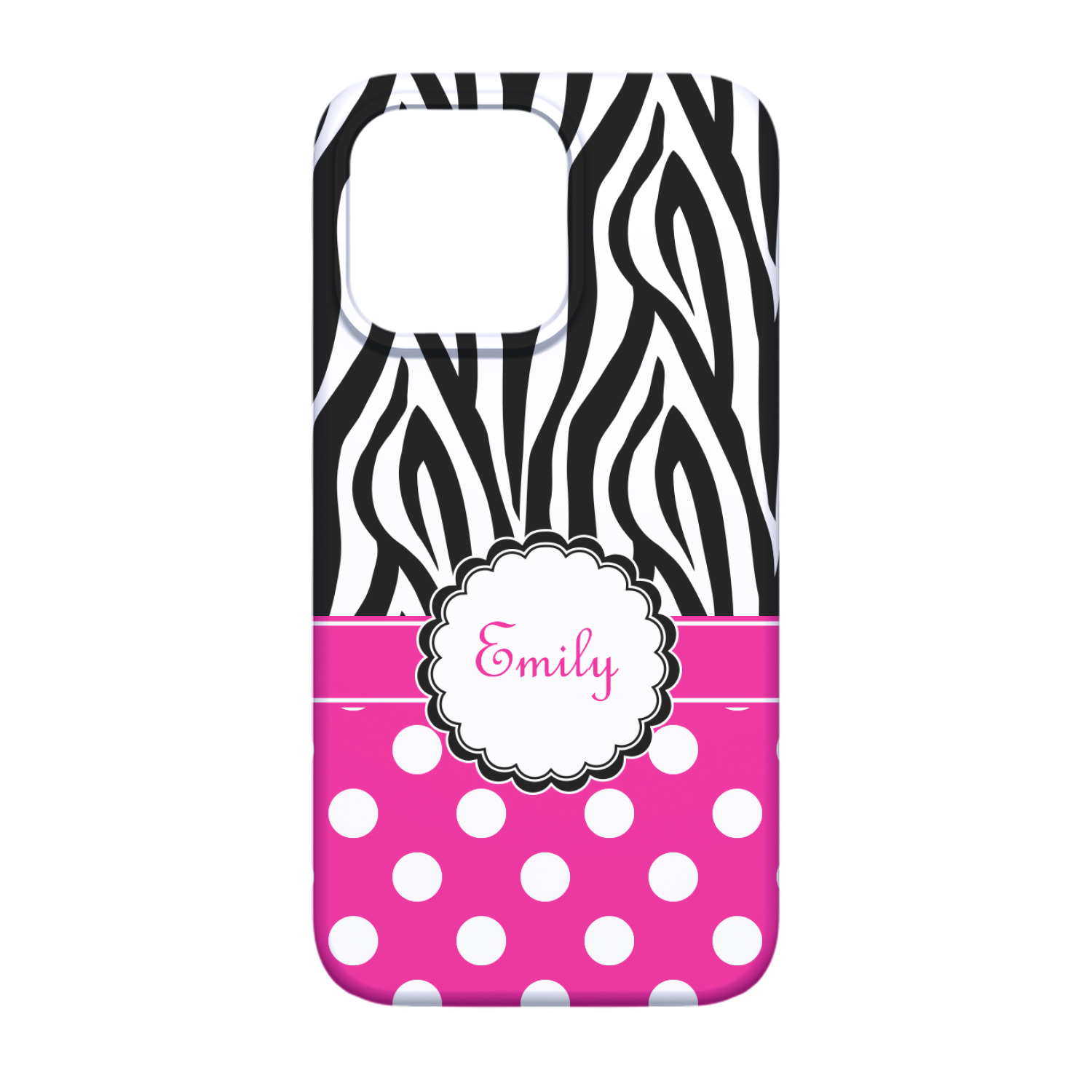 Here is a wonderful zebra print with a fun, modern twist. The top of this design features a black and white traditional zebra print. To add color and flair we have paired the zebra pattern with a fun hot pink and white polka dot pattern on bottom.