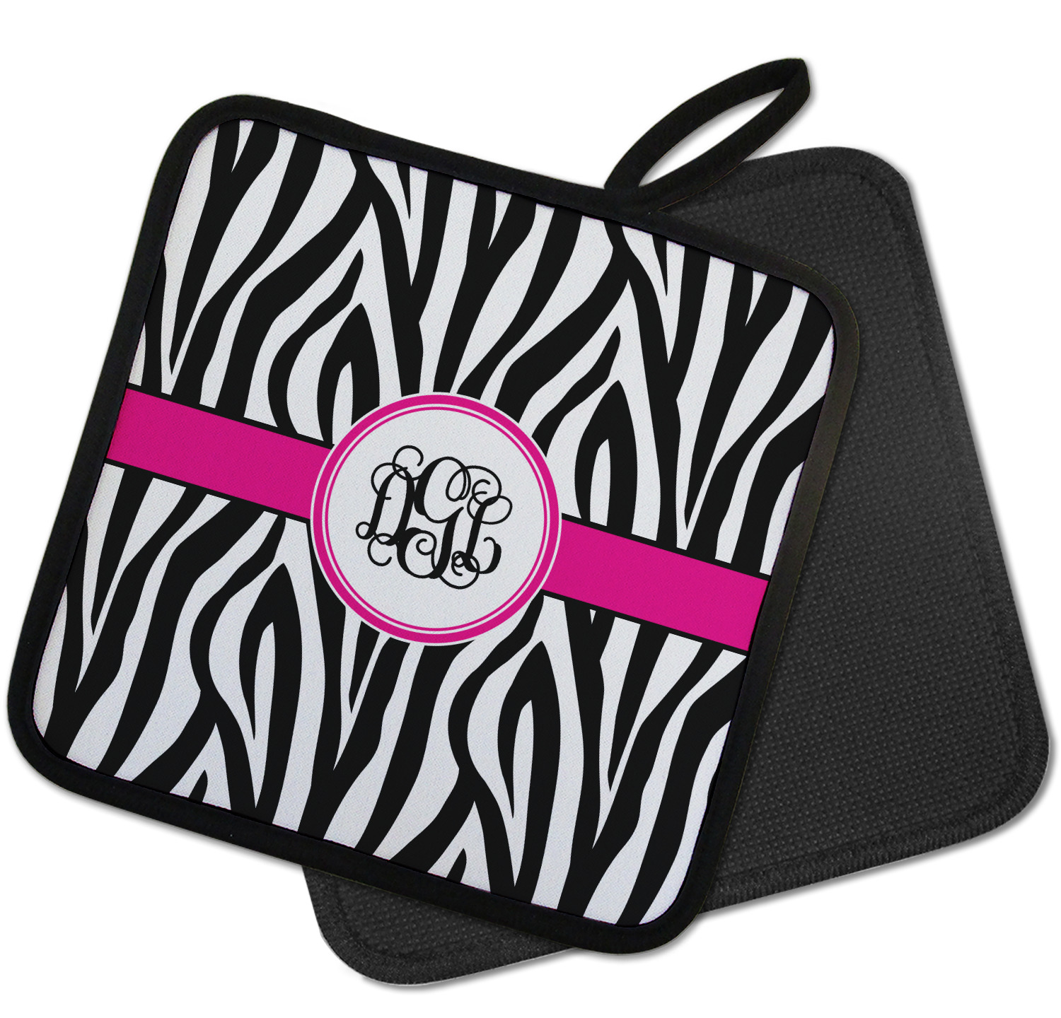Our personalized pot holders feature a neoprene front that displays your personalization in vibrant colors. The backing of the hot pot holder is rubberized; the textured backing allows you to have a great grip when using this custom pot holder. The two materials are joined with a sleek, black trim, and the holder also includes an attached loop for hanging and storage. The pot holder is approximately 8.75 inches by 8.75 inches and 0.25 inches tall, while the fabric loop is 2.5 inches long. You can purchase a kitchen pot holder by itself or as a set of 2. We also offer a set including one pot holder and one oven mitt.