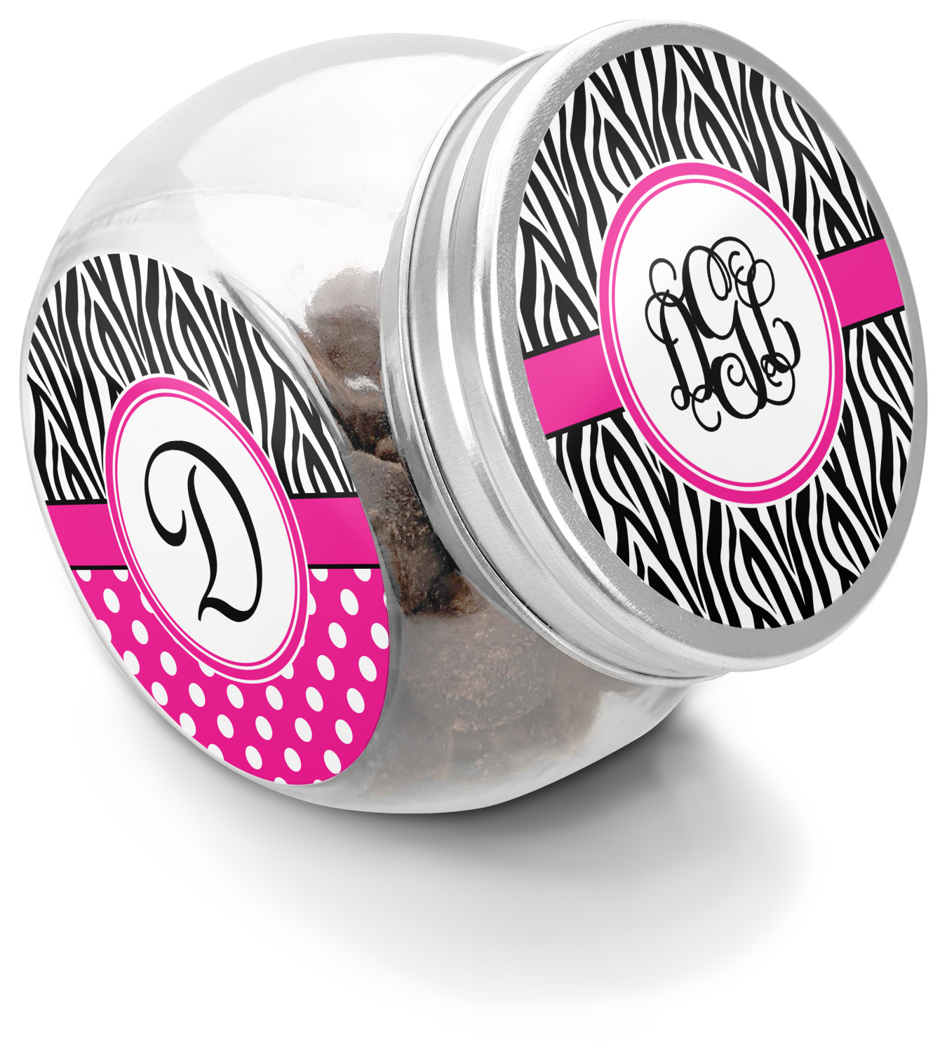 This treat jar is an excellent way to store treats for your favorite canine or feline. Moreover, their delicate, classy appearance makes them a tasteful addition to your countertop's décor. Crafted from clear glass, its unique construction and silver metal, screw-on lid allows for quick and easy access. Three, permanent, vinyl stickers are applied to both sides of the jar and lid, presenting your personalized design. The base of this glass, dog treat jar is 3.4" x 4.75", and the jar stands at 5" tall. Though on the smaller side, this jar is best suited for smaller treats or training treats.