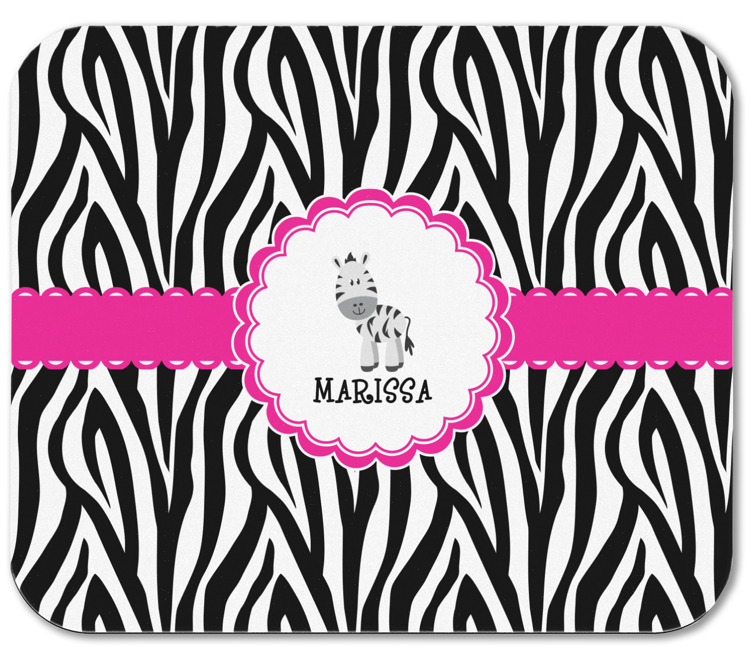 This cute band highlights a scalloped coordinating circle label featuring an adorable zebra. Underneath the zebra there is ample room for personalization of your choice.