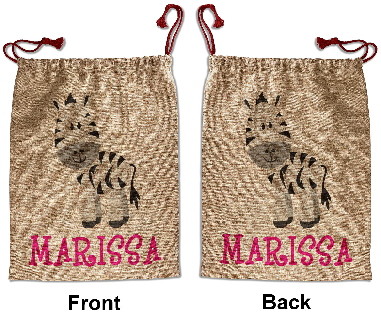 Our Santa sacks print your design on the burlap material giving it a nice rustic, natural design! The burlap material is also machine washable and wrinkle-free, so feel free to fold and store out Santa bags until the next time you need it! Secure your gifts with our red accent drawstring ties at the top of the sack so the mystery of your gift stays a surprise until Christmas day. We offer two types of printing- one side partial print or double-sided partial printing. Design and personalize your own Santa sack in time for the holidays!