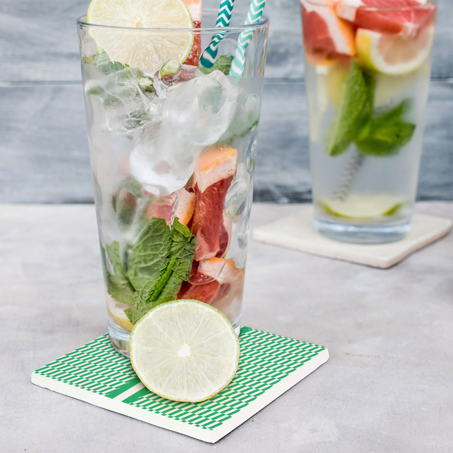 Our super absorbent stone coasters absorb the condensation into the coaster, before it has a chance to flow on to your furniture or table tops, thus preventing watermarks and blemishes.