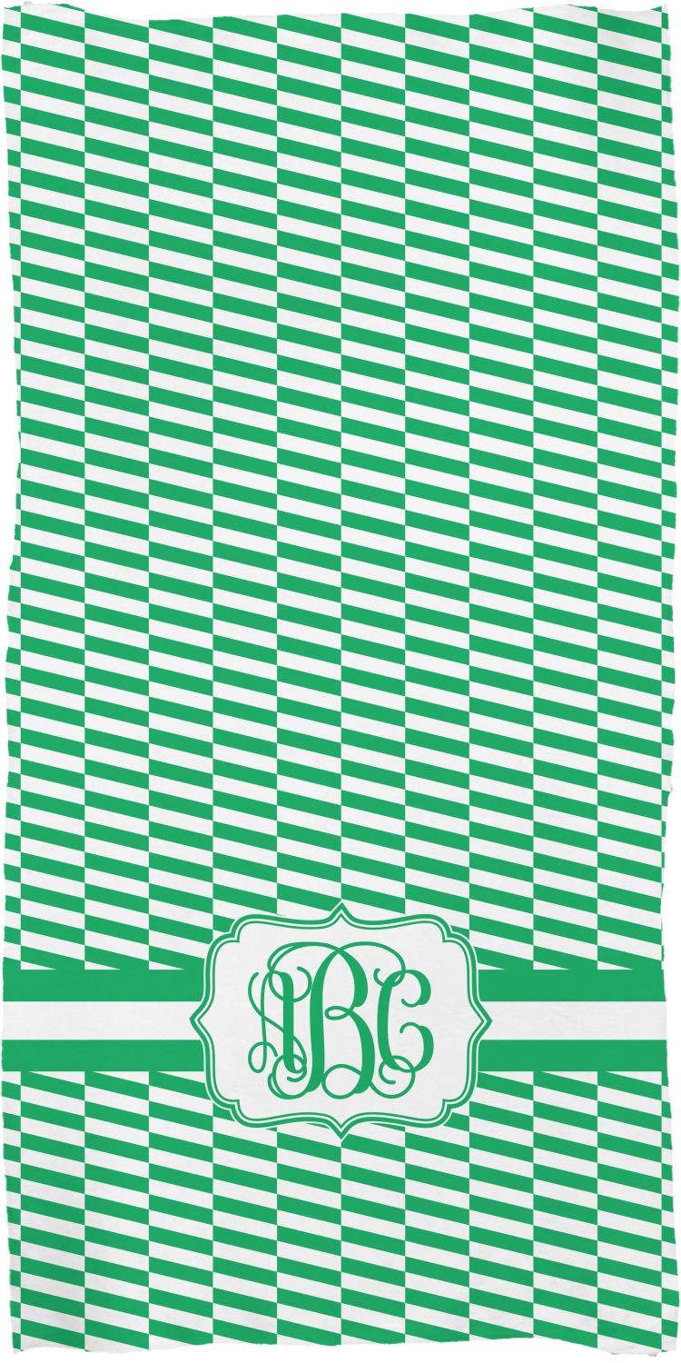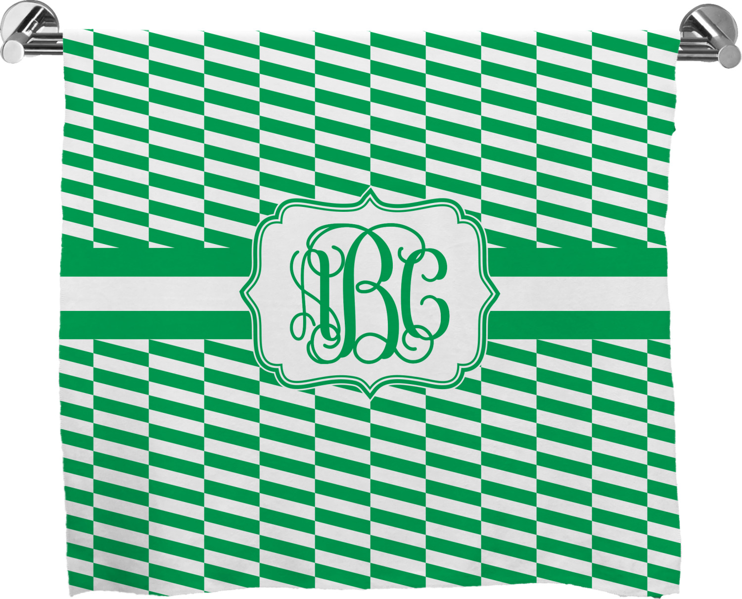 These customized bath towels are slightly larger than your standard towel and are the ideal size for wrapping around your body. They measure approximately 60" x 30". Your customization is displayed across the entire front face of the towel, while the back is white.
