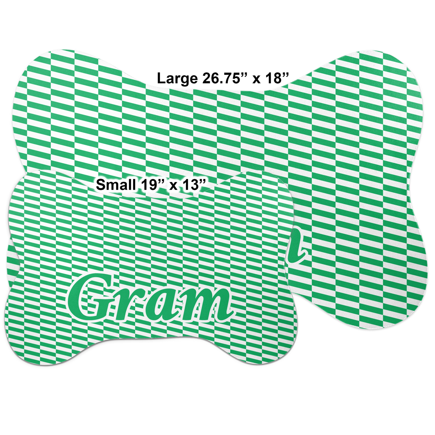 The top of this mat displays your custom design, as it is printed on polyester. To prevent slippage, the underside of the mat is made of rubber. We offer a small dog food mat, suitable for smaller dogs and a large dog food mat for bigger breeds. The small dog food mat is approximately 19 by 13 inches, while the large dog feeding mat measures at approximately 26.75 by 18 inches. Both personalized mats are ideally sized to fit two dog bowls.