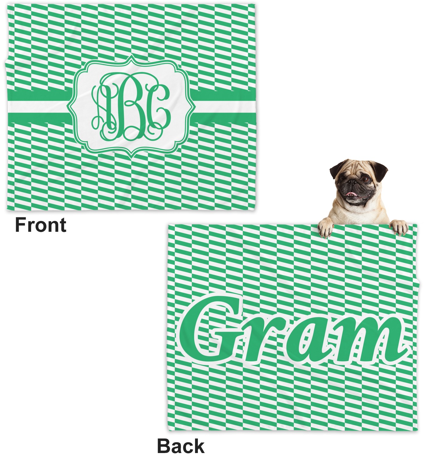 These dog blankets are crafted from a gentle, soft-to-the-touch, minky material. We print your customizations, either matching or differing, on both the top and underside of the blanket. These personalized dog blankets are available in two sizes: regular and large. Our regular size, at 40" x 30", accommodates small and some medium size dogs. At 60" x 50", our large dog blanket is a better fit for bigger breeds. Though specialized for dogs, these blankets still make a thoughtful gift for your favorite feline, or any other pet in mind!