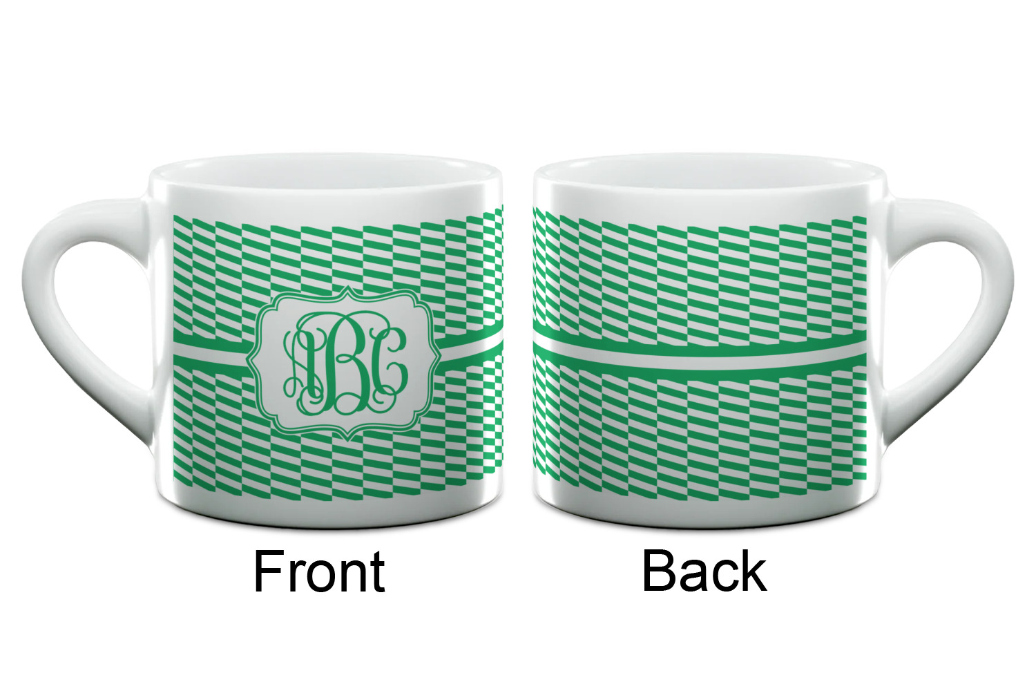 Each of our espresso mugs is a ceramic material sure to keep your drink warm. Personalize one cup for yourself, or order a set of 4! Its the perfect little gift for any coffee lover! We carry two sizes for you to personalize - 3 oz. (approx. 3.25" x 2.325" x 2.625") or 6 oz. (approx. 4" x 2.9" x 2.9"). Our 3 oz. mug is perfect for that single shot espresso while our 6 oz. mug can be your next favorite cappuccino cup holding two shots of espresso!