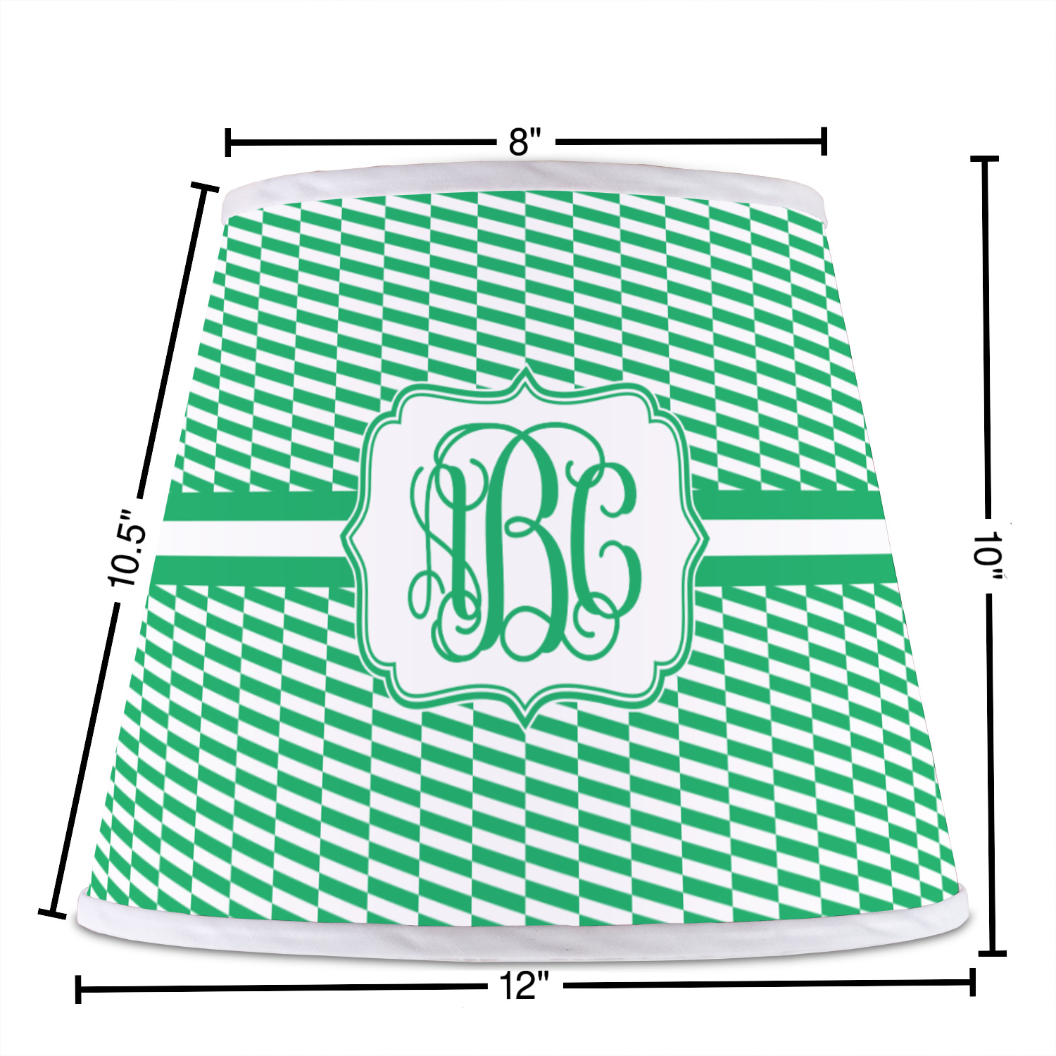 The base of this lampshade is 12 inches in diameter, and the top spans 8 inches in diameter. The total height of the lampshade is 10 inches. The angled nature of this custom lampshade concentrates the light, making it ideal for smaller spaces. This lampshade is made of matte, polyfilm, and displays your customization in its middle. The top and bottom of this colorful lamp shade are lined with a white fabric ribbon (which can be replaced with black inside the design studio) which frames your design and creates a sophisticated finish. As an UNO fitter lampshade, this unique lamp shade will fit a variety of bases.
