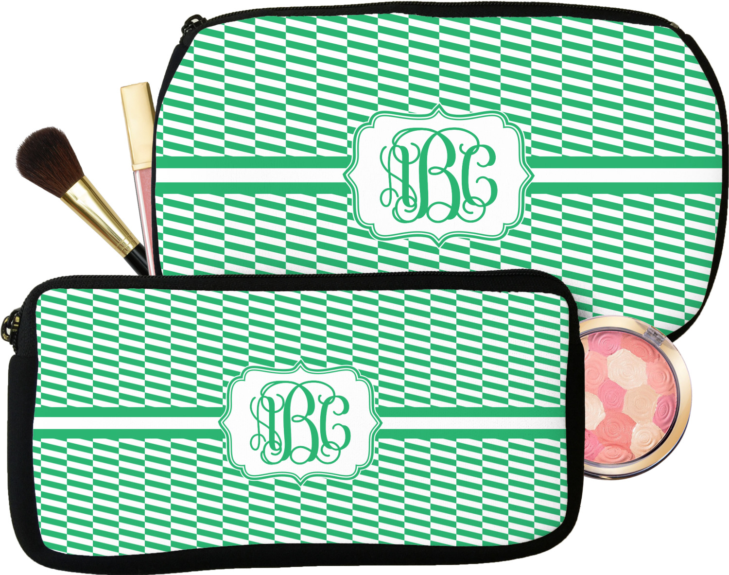Our personalized makeup bags are available in many different designs, patterns and colors - so you are sure to find one that will love. They are made of neoprene (same material as wet-suits) and thus are water resistant, so spillages in your makeup bag will not end up all over you purse. They are customized on one side and are black on the other side and the zipper is black as well.