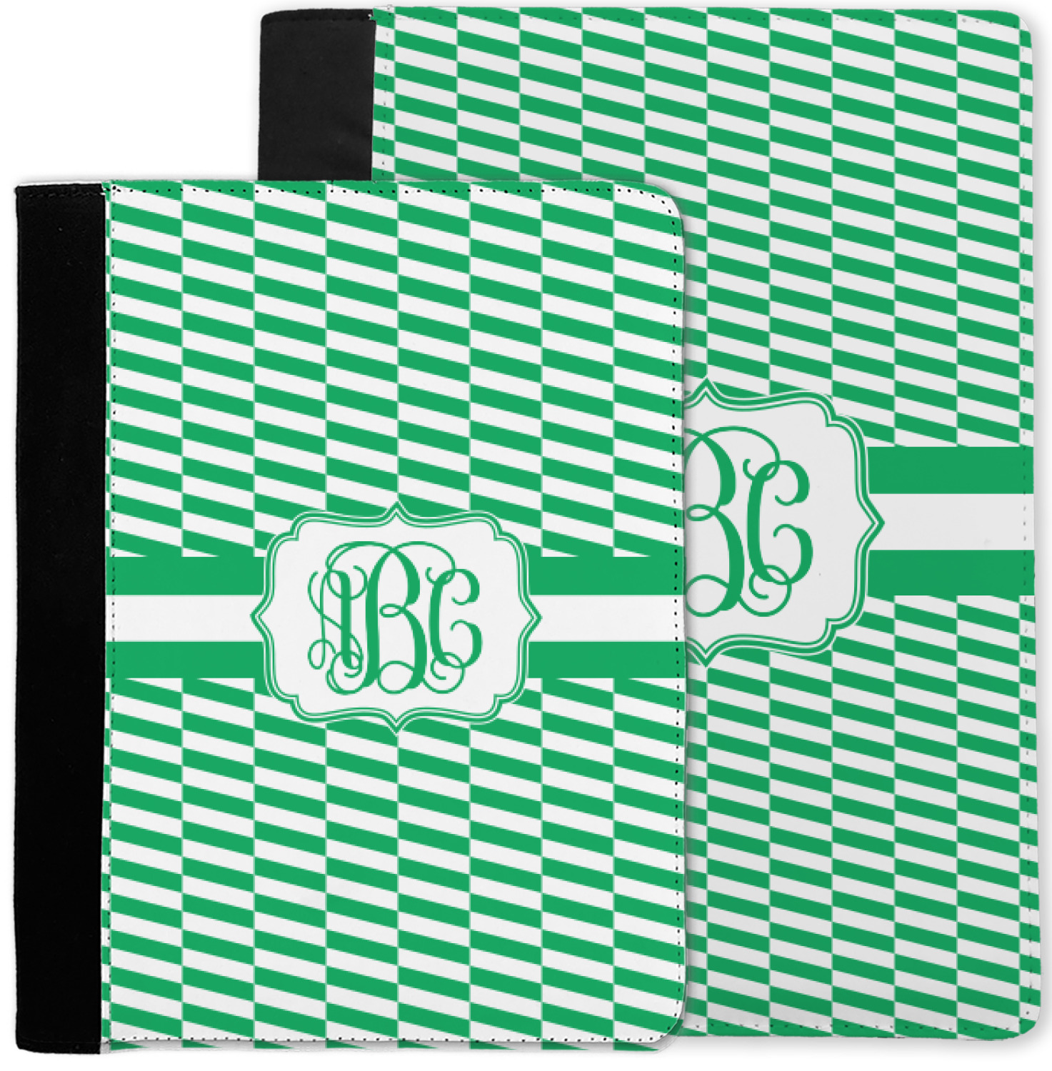 These personalized padfolios are made from a black, polyester microfiber and features a standard, 50-page notepad. However, these black padfolios can accommodate a pad with up to 100 pages. This model also features a slot pocket for any loose sheets of paper, small pockets for business cards, and an elastic band to secure a pen. We print your personalization across the front of this notepad portfolio in bright, vibrant color. These padfolios come in 2 sizes, Medium - approximately 10.25" x 8" for 5" x 8" paper and Large - approximately 12.5" x 8.5" for 8.5" x 11" paper.
