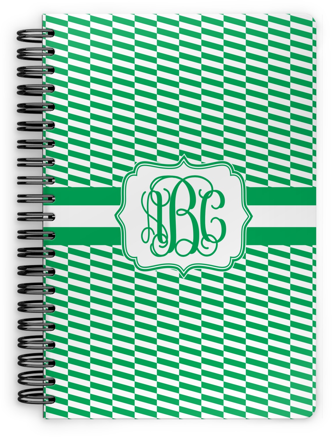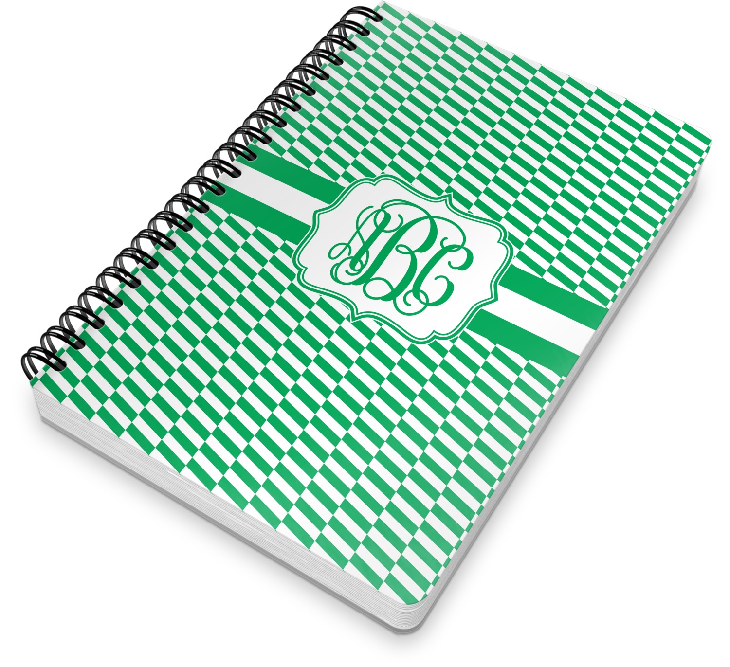 This spiral notebook includes 75 sheets of thick, ruled paper. The front and back of this custom notebook is made of a robust, laminate, plastic covering. We print your personalization on these two panels, underneath a glossy finish, which emphasizes the colors of your design. The two panels and the sheets of paper are held together by a sturdy, black coil. The paper within your bound notebook is perforated for easy, clean tearing.